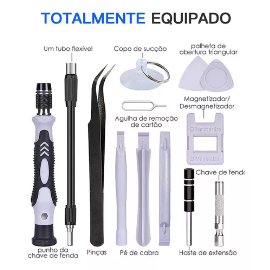ogo de Chave De Fenda 115 em 1 Jogo tem diferentes tipos de ferramentas projetadas para a reparação consoles de jogos, playstation 4, playstation 5, computadores, dispositivos móveis(iphones, samsung, xiaomi, android) chaves manutenção em iphone 4/4s/5/5s/6/6s/7/8/X/11/12/13 e Iphone 14, câmeras de precisão e outros itens como relógios e óculos de alta qualidade e ampla aplicação: Feito de materiais de alta qualidade para maior durabilidade. Diferentes tipos de exercícios pode acomodar muitas formas de parafusos para atender todas as necessidades, equipado com uma caixa de armazenamento profissional: o kit de reparação é equipado com uma caixa de armazenamento feito de material de PP e é resistente ao choque, função magnética e desempenho: a dica sobre a chave de fenda magnética é muito conveniente quando o parafuso é puxado para fora ou o parafuso está alinhado com o buraco. Especialmente para amadores, magnetismo pode melhorar o desempenho e economizar tempo. Uso do produto: ferramentas de manutenção, amplamente utilizado em telefones móveis, digitais, eletrodomésticos e outros campos. Especificações: Pacote inclui: 1 x caixa (plástico) 157*90*52mm 1 x eixo de extensão flexível 1 x barra de extensão 128mm 1 x pinça 122mm 3 x ferramentas de alavanca de plástico (86mm e 82mm) 1 x ferramentas de remoção de cartão sim 33mm 1 x chave 98mm 1 x ventosa 35mm 1 x bloco magnetizar/desmagnetizar 1 x agulha para remoção cartão SIM 3 x palhetas de abertura (35*37mm e 31*33mm) 1 x suporte de broca para chave de fenda elétrica 1 x adaptador sleeve 98 * bit chave de fenda Especificação de chave de fenda: Chave Torx: T2, T3, T4, T5, T5 Chave Pentalobe: 0.8, 1.2, 1.5, 2.0 Chave Tri wing: 0.6, 2, 2.5, 3 Chave Phillips: 0, PH0, PH1, PH1, PH2, Chave Spanner: U2.6, U3.0 Chave Fenda Simples: 1.0, 1.5, 2.0, 2.5, 3.0, 3.5, 4.0, Chave Torx 2: T1, T6, T7, T8, T9, T10, T15, T20 Chave Allen: 0.7, 0.9, 1.3, 1.5, 2.0, 2.5, 3.0, 3.5, 4.0, 4.5, 5, 6 Chave Triangular: 2.0, 2.3, 2.6, 3.0 Chave Pozidriv: 00, PZ0, PZ1, PZ2, Chave: 2.0, 2.5 Chave Robertson:V51, V50, V52 Chave Pino Agulha: 0.8, 1.0 Soquete Phillips: 2.0 Soquete Sextavado: 2.5, 3.0, 3.5, 4, 4.5, 5.0, 5.5 Conteúdo na embalagem: 01 – Alça de liga de alumínio 01 – Barra de extensão 01 – Barra curta 01 – Tubo guia 01 – Pinça 02 – Alavancas 01 – Magnetizador 01 – Paleta de plástico 01 – Paleta de alumínio 01 – Chave de cartão PIN