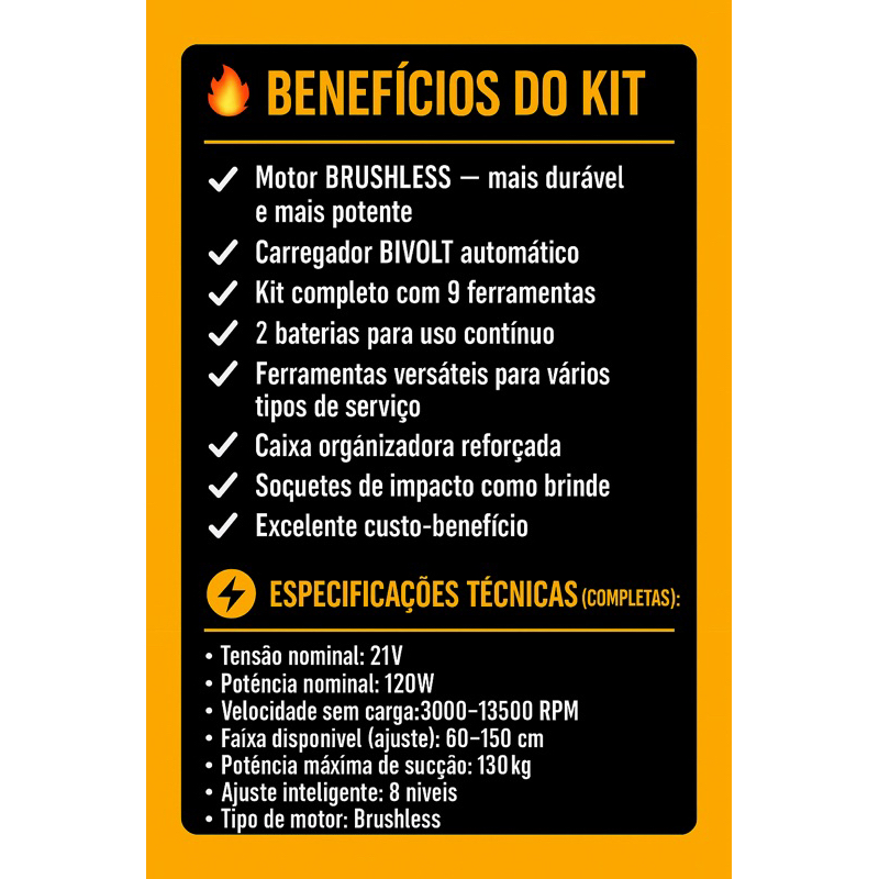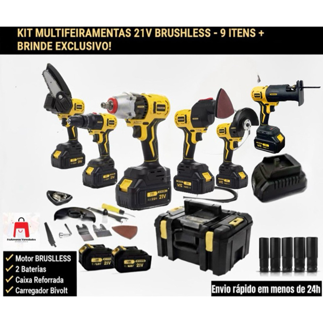 KIT MULTIFERRAMENTAS 21V BRUSHLESS – 9 ITENS + BRINDE EXCLUSIVO! O kit mais completo e versátil da categoria! Equipado com motor BRUSHLESS, garantindo mais potência, resistência e menor aquecimento. Ideal para uso profissional e doméstico, oferecendo alto desempenho em qualquer atividade. ⸻ 📦 O QUE ACOMPANHA (9 ITENS): 1️⃣ Carregador de bateria BIVOLT 2️⃣ Motosserra de 4 polegadas 3️⃣ Caixa plástica organizadora 4️⃣ Serra tico-tico 5️⃣ Furadeira / Parafusadeira 6️⃣ Chave de impacto 7️⃣ Multiferramenta oscilante 8️⃣ Esmerilhadeira 9️⃣ 2 baterias 21V 🎁 BRINDE: • Jogo com 5 soquetes de impacto ⸻ 🔥 BENEFÍCIOS DO KIT : ✔ Motor BRUSHLESS — mais durável e mais potente ✔ Carregador BIVOLT automático ✔ 2 baterias para uso contínuo ✔ Ferramentas versáteis para vários tipos de serviço ✔ Caixa organizadora reforçada ✔ Soquetes de impacto como brinde ✔ Excelente custo-benefício ✔ Envio rápido ⸻ ⚡ ESPECIFICAÇÕES TÉCNICAS • Tensão nominal: 21V • Potência nominal: 120W • Velocidade sem carga: 3000–13500 RPM • Faixa disponível (ajuste): 60–150 cm • Potência máxima de sucção: 130 kg • Ajuste inteligente: 8 níveis • Tipo de motor: Brushless • Carregador: Bivolt (110V/220V) • Baterias: 2 unidades recarregáveis • Uso recomendado: Profissional e doméstico • Maleta / caixa organizadora: Sim • Acessórios: Vários para cada ferramenta