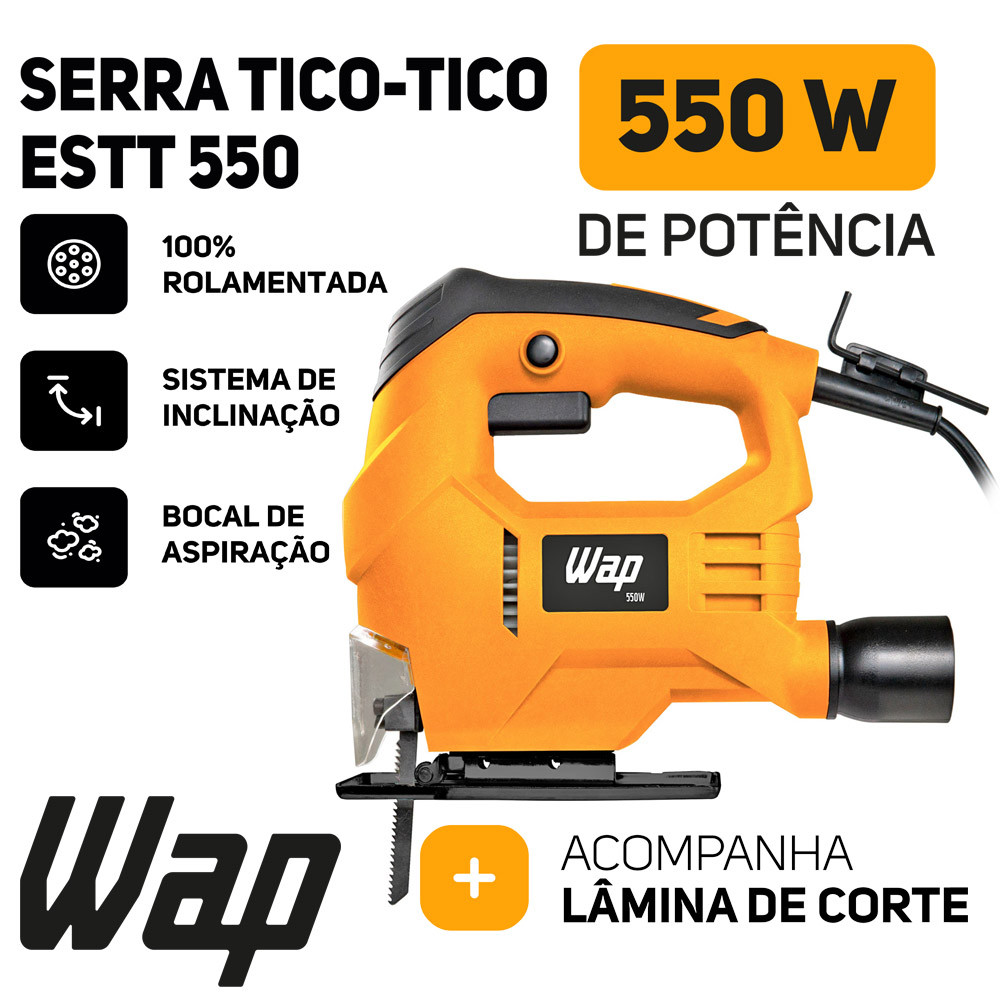 Você estará comprando: 01 Parafusadeira e Furadeira de Impacto WAP WF 700K13 01 Serra Tico Tico ESTT 550 Wap 01 Martelo 01 Empunhadura Auxiliar 01 Trena de 3 metros 01 Chave Phillips 01 Chave de Mandril 01 Chave de Fenda 02 Brocas de Madeira (6 e 8mm) 03 Brocas de Alvenaria (5, 6 e 8mm) 01 Limitador de Profundidade 01 Maleta da Parafusadeira A Parafusadeira e Furadeira de Impacto WAP WF 700K13 tem 700W e mandril de ½”. Com função impacto, acessórios e controle de velocidade, é ideal para aço, madeira e alvenaria, garantindo precisão e conforto. Grandes projetos exigem uma ferramenta potente e robusta, assim como a Parafusadeira e Furadeira de Impacto WAP WF 700K13. Com 700W de potência e Mandril de ½” (13mm), seu principal diferencial é a função de perfurar com impacto. Além de girar, a broca dá pequenos impactos para frente, tornando o trabalho em materiais rígidos mais fáceis. Para facilitar ainda mais seus projetos, a ferramenta acompanha uma maleta com 11 acessórios, que incluem: três brocas para alvenaria (5, 6 e 8mm), duas brocas para madeira (6 e 8mm), chave de fenda, chave Philips, trena de 3m, martelo, chave de mandril, empunhadura auxiliar e limitador de profundidade. Conte com a empunhadura emborrachada e ergonômica da ferramenta, além da empunhadura auxiliar removível, para garantir mais estabilidade e conforto em trabalhos longos. Para maior segurança, utilize o limitador de profundidade e evite furos maiores que o necessário ou até acidentes. Facilite seus trabalhos com total controle ao parafusar ou desparafusar, com torque máximo de 40Nm, basta usar o seletor de sentido de rotação. Já o seletor de velocidade, integrado ao gatilho, permite ajustar a potência conforme a necessidade, garantindo precisão. E para trabalhos prolongados, o botão trava assegura um acionamento contínuo, trazendo mais conforto ao uso. Ao alternar entre perfuração com ou sem impacto, utilize o botão comutador localizado na parte superior da ferramenta. A troca de brocas e bits é prática ao usar a chave de mandril, que solta e aperta as três garras com eficiência. Além disso, o suporte mantém a chave sempre acessível, agilizando suas tarefas. Ideal para trabalhos em aço (13mm), madeira (25mm) e alvenaria (16mm), faça trabalhos de qualidade semiprofissional com a Parafusadeira e Furadeira de Impacto WAP WF 700K13, a ferramenta que irá transformar sua rotina! Informações Técnicas: Modelo: WF 700K13 Tensão: 127v ou 220v (Escolher, quando disponível) Corrente Elétrica: 2,3A (127V) - 1,3A (220V) Potência Elétrica: 700W Frequência: 60 Hz Tipo de Motor: Universal Mandril: 1/2 Polegada (13mm) Número de Impactos: 48000 min-1 Rotações: 3000 Rpm Torque: 40Nm Funções: Parafusadeira e Furadeira Comprimento do Cabo Elétrico: 2 metros Dimensões do Plugue: 10A (127V e 220V) Perfuração na Madeira: 25 mm Perfuração no Aço: 13 mm Perfuração na Alvenaria: 16 mm Classe de Isolação: IPX20 Cor: Amarelo e preto Material: Plástico, metal e borracha Dimensões do Produto Montado CxLxA: 26 x 10,5 x 26 cm Dimensões do Produto Desmontado CxLxA: 26 x 6,5 x 26 cm Peso Aproximado da Parafuradeira: 1,6 kg Dimensões da Embalagem CxLxA: 27 x 7,8 x 27,3 cm Peso na Embalagem: 2,7 kg Garantia: 12 Meses Informações da Serra Tico Tico: Fácil de usar, ergonômica e muito versátil! A SERRA TICO TICO ESTT550 é perfeita para quem busca um produto de alta qualidade para vários tipos de cortes precisos e rápidos. Sua potência é de 550W e possui um sistema 100% rolamentada, onde proporciona uma maior vida útil, com qualidade e eficiência para vários tipos de trabalhos. Com ela é possível realizar cortes circulares, angulares e retos, ideal para cortar aço (3mm), polímeros (10mm) e madeira (55mm), garantindo alta performance para trabalhos manuais. Além disso, possui uma base ajustável com sistema de inclinação de 0º a -45º para cortes angulares. Sendo uma opção de ferramenta leve que facilita na execução de trabalhos manuais. Sua empunhadura é emborrachada, proporcionando melhor ergonomia e conforto. Conta com um protetor frontal transparente com acesso a troca da lâmina, tornando seu uso mais prático e seguro. Para facilitar trabalhos contínuos a Serra Tico-Tico ESTT 550 contém um botão trava e um bocal direcionador de resíduos, ideal para manter o ambiente de trabalho sempre limpo, com essa ferramenta você garante todos os recursos para obter os melhores resultados de uma forma ainda mais prática! Seus acessórios vão te dar autonomia durante o uso, sendo eles: porta-chave allen, a chave allen, lâmina de corte, bocal de aspiração. Garantindo mais eficiência e qualidade nas execuções de trabalhos. Informações Técnicas: Modelo: ESTT 550 Tensão: 127v ou 220v (Escolher, quando disponível) Potência: 550w Motor: Universal Frequência: 60hz Corrente Elétrica: 3A Capacidade de Corte em Madeira: 55mm Capacidade de Corte em Aço: 3mm Capacidade de Corte em Polímeros: 10mm Aplicação: Corte Circular, Angulares e Retos. Número de Golpes: 3.000 golpes por minuto Ângulo do corte