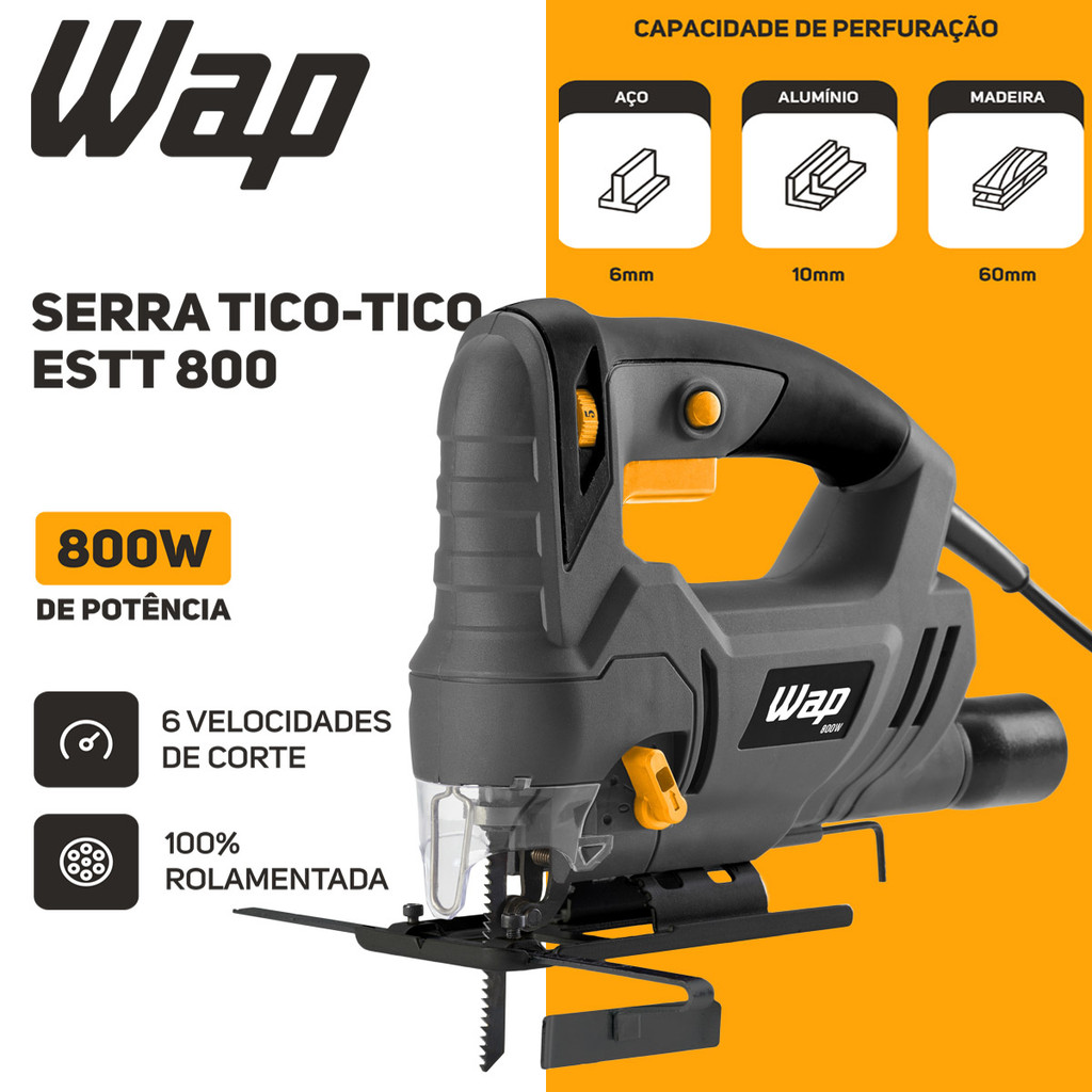 Você estará comprando: 01 Parafusadeira WF 700K10 Acessórios da Parafusadeira: - 01 Chave de mandril - 01 martelo - 01 empunhadura auxiliar - 01 maleta organizadora - 01 Trena de 3m - 01 chave phillips - 01 chave de fenda - 02 brocas de madeira (6 e 8mm) - 03 brocas de alvenaria (5, 6 e 8mm) - 01 limitador de profundidade 01 Serra Tico Tico Estt 800 Acessórios da Serra: - 01 Bocal de Aspiração - 01 Chave Allen - 01 Guia de Corte Paralela Informações da Parafusadeira e Furadeira de Impacto WAP WF 700K10: Mais força para o seu trabalho! Garanta resultados de qualidade em seus projetos com uma ferramenta robusta e de qualidade. Ideal para atividades ocasionais, a Parafusadeira e Furadeira WF 700K10 permite executar perfurações seguras e práticas, com ou sem impacto. A ferramenta possui um motor potente de 700W e mandril de (3/8”) com capacidade para brocas de até 10mm. Além da empunhadura ergonômica da WAP WF 700K10, o punho auxiliar multidirecional do acessório se adapta facilmente às necessidades de profissionais e entusiastas. Seu botão comutador permite executar diferentes tipos de perfurações, independente da tarefa. A versatilidade do equipamento permite que você possa utilizá-lo para perfurações sem impacto em objetos de madeira e aço, assim como perfurações com impacto em peças de concreto e alvenaria, com excelência. Durante trabalhos contínuos, a Parafusadeira e Furadeira de Impacto WAP dá exemplo de desempenho. O botão trava da ferramenta elimina a necessidade de manter o interruptor de acionamento do motor pressionando o tempo todo. Equipada com controlador de velocidade de diferentes níveis, ele permite aplicar a força ideal para cada tipo de projeto. O seletor de reverso da WF 700K10 facilita o ato de parafusar e desparafusar, levando muito mais praticidade para o seu dia a dia. Para completar, a ferramenta WAP acompanha o limitador de profundidade, que torna a operação precisa durante o trabalho e a chave mandril, troca e aperto de brocas. Tenha uma solução completa para dar start no seu projeto! Em uma maleta compacta, a ferramenta vem com 11 acessórios, entre eles: punho auxiliar multidirecional, limitador de profundidade, trena de 3 metros, chave philips, chave de fenda, brocas para madeira (6 e 8 mm), brocas para alvenaria (5, 6 e 8 mm) e martelo. Informações Técnicas: Modelo: WF 700K10 Marca: Wap Tensão: 127V ou 220V (Escolher no momento da compra se estiver disponível) Potência Elétrica: 700W Frequência: 60 Hz Mandril: 1 - 10 mm ( 3/8" ) Número de Impacto: 48.000 min-1 Corrente Elétrica: 4 A e 2 A Torque: 40 Nm Motor: Universal Capacidade de Perfuração em Madeira: 20mm Capacidade de Perfuração em Aço: 10mm Capacidade de Perfuração em Concreto: 10mm Velocidades: 2 Rotações: 3000 RPM Função Impacto: Sim Sistema Reverso: Sim Cabo Elétrico: 1 m Classe de Isolação: II Cor: Cinza e Amarela Peso Aproximado: 2,6 kg Dimensões do Produto (CxLxA): 25 x 20,2 x 7 cm Dimensões Embalagem (CxLxA): 29 x 8,6 x 27,9 cm Garantia: 01 ANO Informações da Serra Tico Tico Estt 800 Wap A Serra Tico Tico WAP ESTT 800 é uma ferramenta capaz de executar cortes retos e curvos, além de outras formas personalizadas de corte. Com potência elétrica de 800W, é uma ferramenta versátil que pode ser usada em diversos tipos de materiais, como aço, alumínio ou madeira. Com seletor de velocidade, você pode escolher do nível 1 ao 6, para maior controle e desempenho do trabalho. O encaixe da lâmina é fácil e rápido, através do sistema de troca de lâminas sem chaves. Conta com 3 posições de ajuste para avanço pendular, para cortes mais rápidos. Ideal para manutenções, faça você mesmo, pequenas reformas, e até para quem deseja realizar trabalhos mais robustos. É uma ferramenta elétrica com base ajustável para cortes angulares, com maior precisão e velocidade durante o uso. A Serra Tico Tico WAP ESTT 800 possui pega ergonômica e emborrachada, além de botão trava para trabalhos contínuos, oferecendo maior praticidade e conforto durante o uso. Vem com bocal de aspiração que permite a sua conexão a um aspirador de pó, o que ajuda a manter a limpeza do ambiente, garantindo uma operação mais eficiente e profissional. Com guia de corte paralela, os cortes ficam muito mais precisos. A ferramenta também possui um suporte para guardar a chave Allen, o que ajuda a trabalhar com mais organização. Informações Técnicas: Modelo: ESTT 800 Marca: Wap Potência: 800 Watts Tensão: 127v ou 220v ( Escolher conforme disponibilidade). Golpes no Vazio: 0-3.000 min-1 Ângulo de Corte: -45° / +45° Perfuração em Aço: 6mm Perfuração em Alumínio: 10mm Perfuração em Madeira: 60mm Cor: Cinza com Amarelo e Preto Dimensões do Cabo Elétrico: 2 Metros Base regulável com regulagem de inclinação de 0 a 45°c. Ajuste Pendular: 3 Níveis Engate Rápido com Encaixe T Dimensões do Produto CxLxA: 21,5x7,5x21cm Peso Aproximado: 2,25 Kg Dimensões da Embalagem CxLxA: 26x 8x21,5cm Garantia: 1 ANO