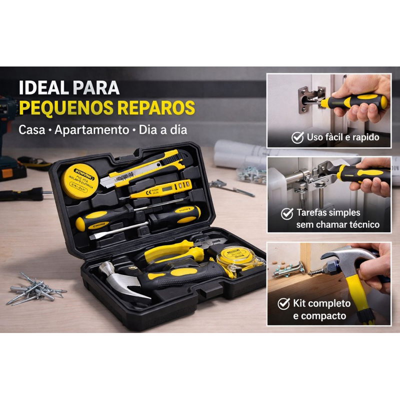 Kit de Ferramentas 9 Peças completo, ideal para uso doméstico, pequenos reparos, manutenção e emergências. Acompanha maleta resistente para organização e transporte fácil. Produto novo, envio rápido e embalagem segura. Tenha sempre as ferramentas certas em casa com este Kit de Ferramentas 9 Peças Completo. Ideal para uso doméstico, o kit atende reparos rápidos, montagem de móveis, ajustes elétricos simples e manutenção em geral. ✔ Kit completo e funcional ✔ Ferramentas resistentes ✔ Cabos anatômicos ✔ Maleta organizadora durável ✔ Fácil de transportar e armazenar CONTEÚDO DO KIT: - 1 Chave Ajustável - 1 Alicate de arame - 1 Fita Métrica 2M - 1 Estilete - 1 Chave de fenda Phillips - 1 Chave de fenda de ponta chata - 1 Testador de tensão Indicado para casa, apartamento, carro, escritório ou pequenos serviços.