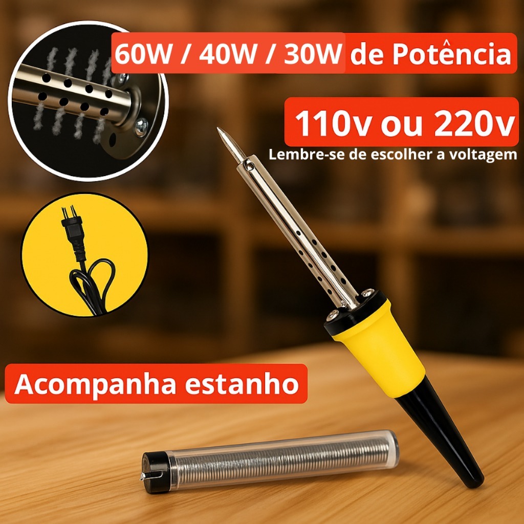 soldering iron 🔥 FERRO DE SOLDA PROFISSIONAL – ALTA PERFORMANCE E ENTREGA EXPRESSA! 🔥 💡 Precisa de precisão e rapidez nos seus trabalhos de soldagem? Este Ferro de Solda Profissional foi desenvolvido para oferecer aquecimento rápido, acabamento impecável e máxima durabilidade, ideal para eletrônicos, artesanato, manutenção e reparos em geral. ✨ Principais Benefícios: Aquecimento Ultra-Rápido – pronto para uso em poucos segundos, sem perda de tempo. Design Ergonômico – cabo confortável e seguro, que evita fadiga mesmo em uso prolongado. Bico de Alta Precisão – perfeito para trabalhos delicados e detalhados. Durabilidade Superior – estrutura resistente ao calor e uso contínuo. Segurança Garantida – material isolante e proteção contra superaquecimento. ⚡ Especificações Técnicas: Voltagens Disponíveis: 127V ou 220V (escolha no momento da compra) Potência ideal para soldagens rápidas e eficientes Plugue padrão brasileiro 📦 Variações Disponíveis: Ferro de Solda Avulso – escolha a voltagem desejada. Kit Completo – ferro de solda + estanho de alta qualidade. Estanho Avulso – ideal para reposição e uso contínuo. 🚀 Ideal para: Reparos eletrônicos e placas de circuito Montagem de componentes Artesanato e projetos DIY Trabalhos escolares e de engenharia ✅ Envio Expresso para todo o Brasil ✅ Produto testado e aprovado ✅ Qualidade garantida ou seu dinheiro de volta 💥 Garanta já o seu Ferro de Solda Profissional e leve sua produtividade para outro nível! 💥