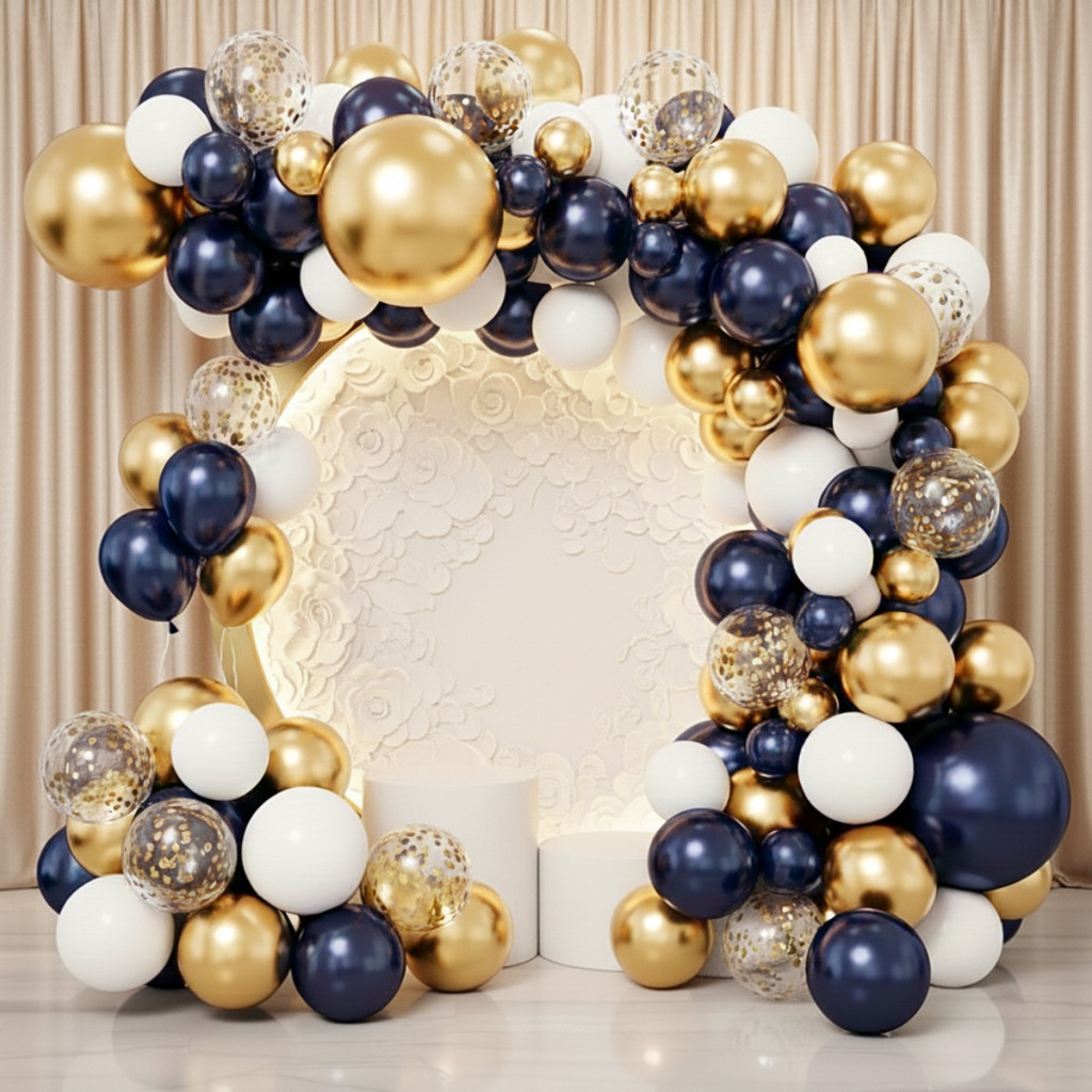 Kit Festa 155 Balões + Fita Bexiga Azul Branco Liso Cromado Dourado Arco Desconstruído Decoração Aniversario Enfeite
