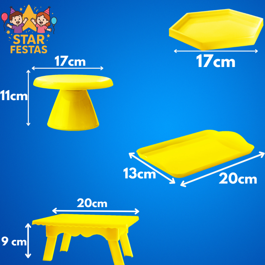 Transforme qualquer comemoração em um verdadeiro espetáculo com o Kit Star Festas. Desenvolvido para quem busca praticidade, elegância e um visual impactante, esse conjunto é perfeito para festas infantis, aniversários, batizados, chás, eventos escolares e comemorações especiais. Com peças em plástico resistente de alta qualidade, o kit oferece durabilidade, acabamento impecável e fácil higienização, além de um design clássico que valoriza doces, bolos e lembrancinhas. MEDIDAS - Boleira Cake Renda 19cm (Largura) x 11cm (Altura) Vaso Grego 12,5cm (Largura) x 19cm (Altura) Bandeja Oval Pérola 13cm (Largura) x 20cm (Comprimento) Bandeja mini Sextavada 17cm (Largura) x 17cm (Comprimento) Bandeja Retangular Simples 13cm (Largura) x 20cm (Comprimento) Boleira Romana 17cm (Largura) x 11cm (Altura) Boleira Cake Slim 17cm (Largura) x 11cm (Altura) Mesinha 20 cm(Comprimento) x 14cm (Largura) x 9cm (Altura)