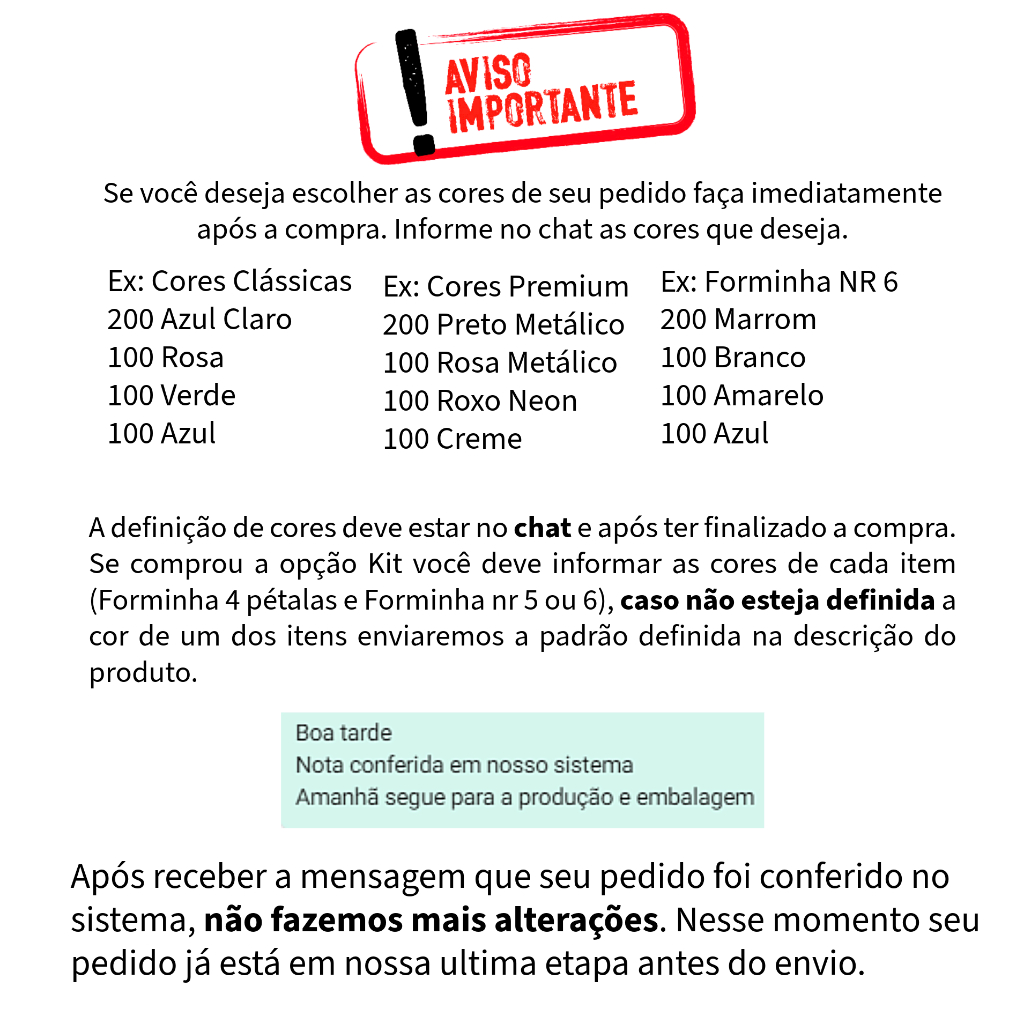 ATENÇÃO: LEIA A DESCRIÇÃO DO PRODUTO E CASO TENHA DUVÍDA ENTRE EM CONTATO. Você pode escolher as cores do seu pedido nos informando no chat conforme abaixo. Quando realizar a compra na opção de 50/100% colorido ou 50/100% Neon/Metalica, você deve entrar em contato pelo chat e informar as cores que deseja. Lembrando a quantidade mínimo enviada são 100 unidades por cor. Cores Clássicas e Neon/Metalica tem diferença de custos, não atenderemos solicitações de cores Neon na compra das cores clássicas por isso verifique o item que está no carrinho. Informe de imediato as cores que deseja, assim que o pedido é conferido não alteramos as cores que seram enviadas. COMPRA KIT FORMINHA NR 5 Segue a mesma regra das forminhas clássicas, após a compra você informe as cores que deseja, caso não informe enviaremos o item branco que é o padrão. Pacotes de 100 unidades. DEFINIÇÃO DE CORES DOS PEDIDOS MESCLADOS. Após a compra entre no chat e nos informe as cores que deseja dos itens comprados, após impressão da nota e conferência não alteramos as cores que serão enviadas. Sua mensagem de definição de cores tem que vir depois da sua compra, mesmo que você já tenha informado em uma conversa anterior. Só consideramos o que foi definido após a sua compra. CASO NÃO INFORME A COR ENVIAREMOS O PEDIDO COM CORES DISPONÍVEIS E SORTIDAS. ATENÇÂO NÂO TEMOS PACOTES DE 50 UNIDADES. Trabalhamos com papel de alta qualidade. Descrição do Produto : Forminha 04 Pétalas Branca ou colorida Tamanho: Alt. 2,5 cm / Base 3,3 cm / Base 3,3 cm Papel FCard : 150/180 grs Forminha 04 Pétalas Kraft Tamanho: Alt. 2,5 cm / Base 3,3 cm / Base 3,3 cm Papel Kraft 150 grs Quantidade mínima: 500 unidades de cada item Obs: Verifique os detalhes de sua compra (Tamanho/Cor/Tipo de Papel/Peso), caso tenha alguma duvida entre em contato, teremos o mais prazer em responder.