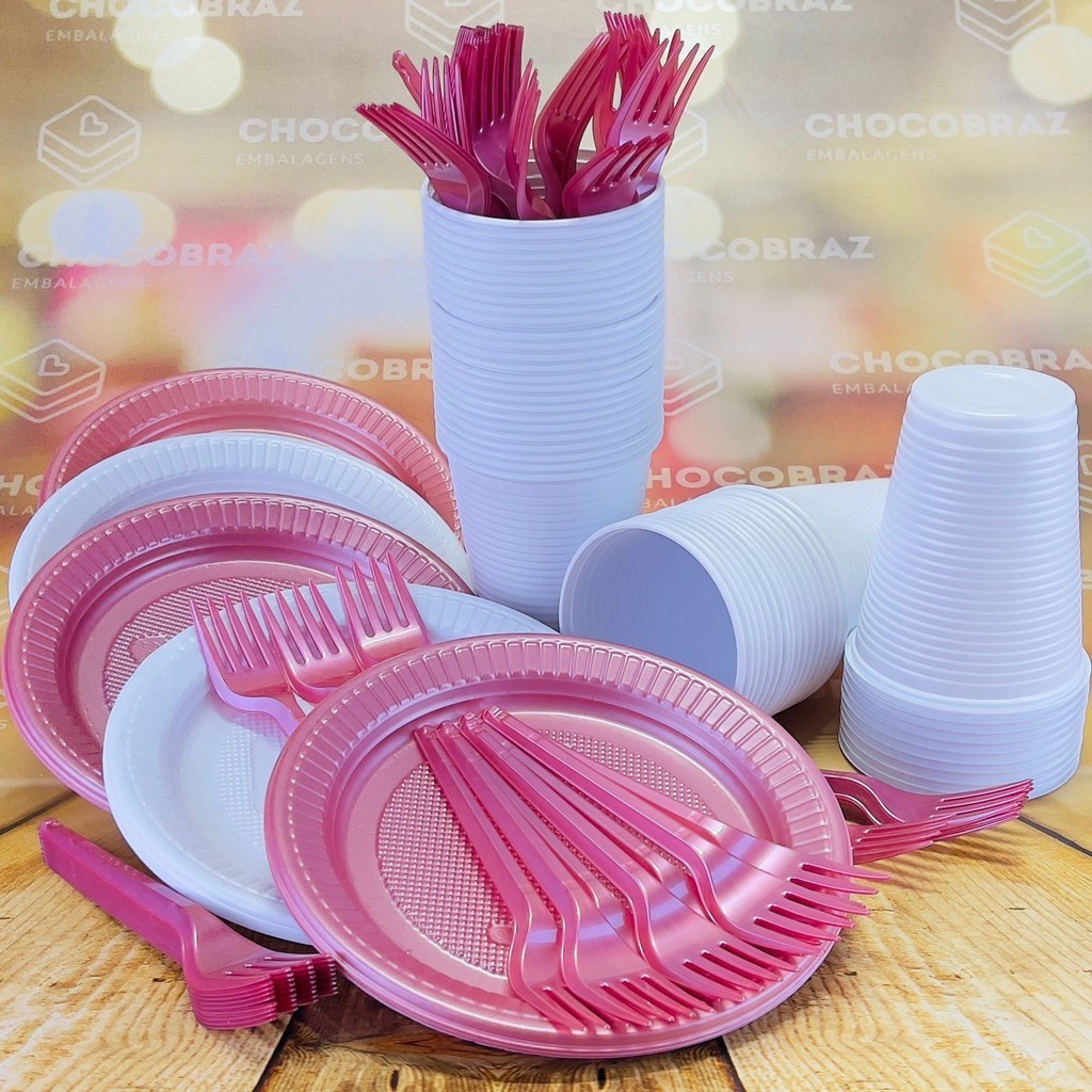 Kit Festa 50 PESSOAS DESCARTAVEIS BRANCO E ROSA PEROLADO GARFO + PRATO + COPO