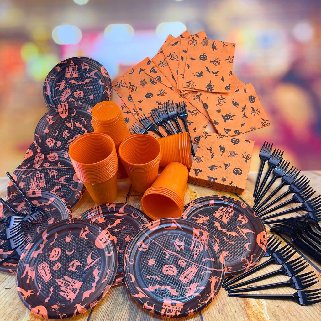 KIT FESTA 50 PESSOAS LARANJA HALLOWEEN PRATO+COPO+GARFO+GUARDANAPO