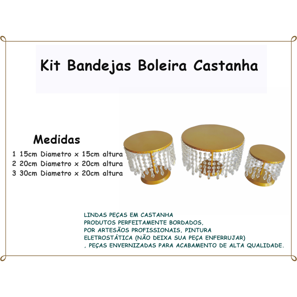 Kit Festa Bandejas E Boleira Decoração Luxo Metal Pedrarias Castanha 3 Peças