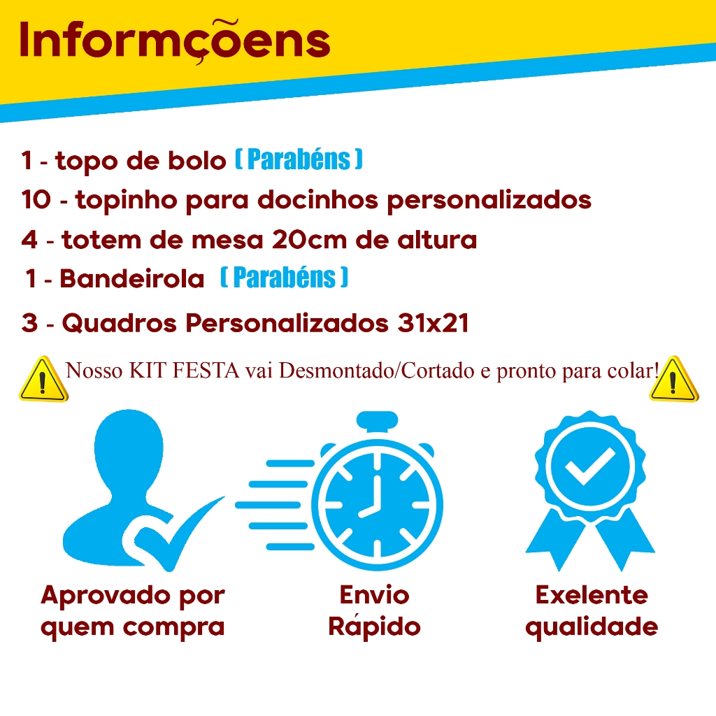 Kit festa --- POSTAMOS SUA ENCOMENDA NO PRAZO MÁXIMO DE 24h --- ------------------------------(IMPORTANTE)------------------------------- Para a personalização do Topo, nos envie imediatamente após a compra o nome e idade a serem colocados no kit, você pode enviar pelo chat ou deixar no campo de mensagem que aparece na hora da compra, caso não envie o topo vai com a escrita "Parabéns" e sem a Idade. ⚠️TEMOS APENAS 10 minutos para personalização do seu KIT. ⚠️ ---------------------------------------------------------------------------------- Primeiramente, ficaremos muito FELIZES, se nos escolher para fazer parte desse momento tão ESPECIAL, faremos tudo com muito CARINHO. Segue algumas observações sobre nosso kit. Kit Completo: 3 Quadros Topo de bolo Bandeirola 4 Totem de mes 10 tags para docinhos ⚠️( Já vem recortado para apenas você colar )⚠️ ----------------------------------------------------------------------------------- Também pode optar apenas pelo topo de bolo, que vem personalizado! ----------------------------------------------------------------------------------- - Produtos desenvolvidos em papéis de 180g. - Os itens são enviados já cortados só colar -Tudo é impresso em papel fotográfico com alta resolução e recortado em plotter de recorte, ficando assim com um acabamento perfeito! . Temos muitos outros kits à sua disposição e trabalhamos com diversos temas. Caso não encontre algum, pode chamar um de nossos vendedores no chat. --------------------------------------------------------------------------------- Nossos kits são ideais para comemorar Aniversário, Mesversário, decoração de festas, festinhas etc. Muito Obrigada.