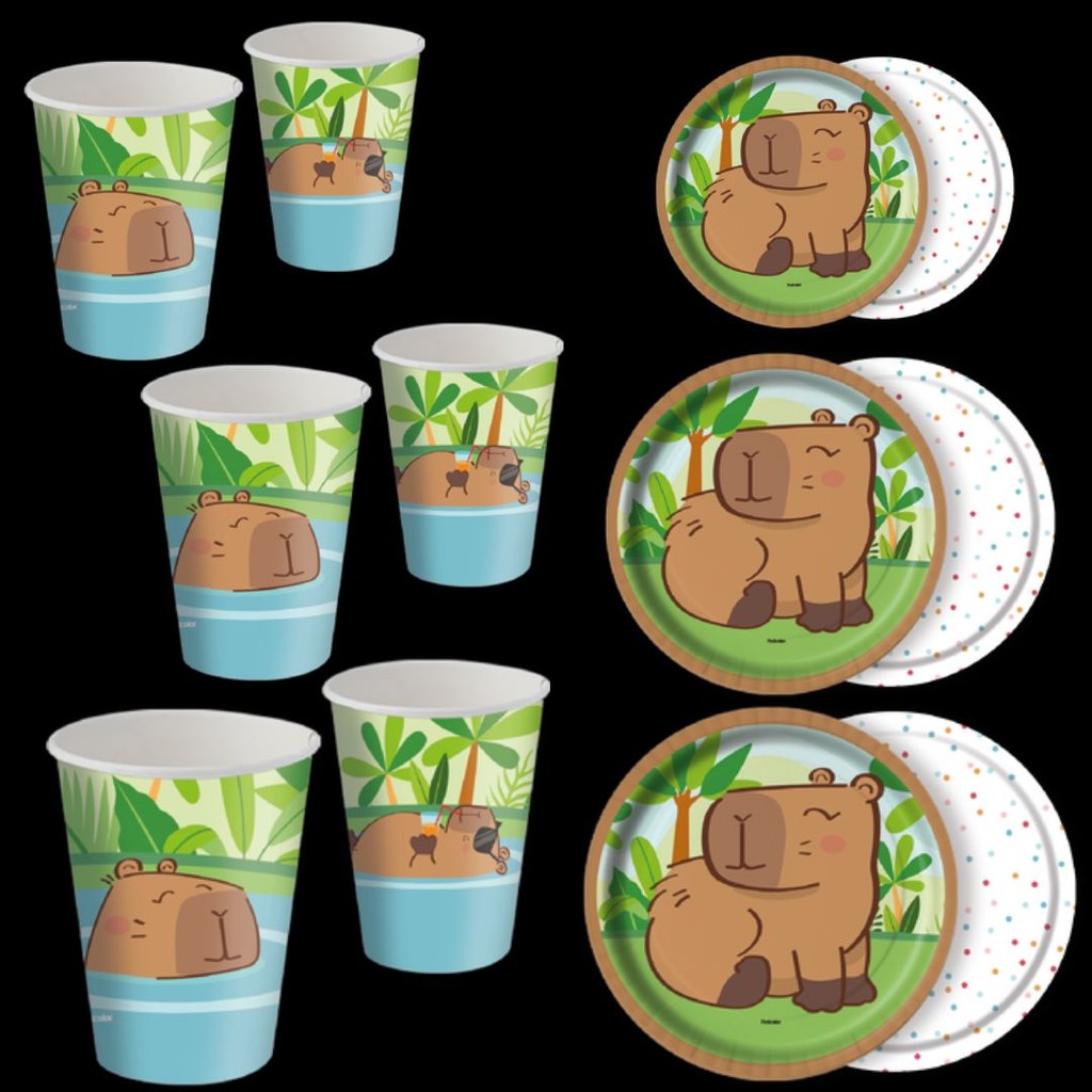 KIT FESTA CAPIVARA 8 PRATOS + 8 COPOS DESCARTÁVEL 200 ML PAPEL - FESTCOLOR