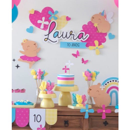 KIT FESTA CAPIVARA PERSONALIZADO MESVERSÁRIO | Aniversário Decoração Casa e Escola | Essa é a melhor opção para comemorações mais intimistas, voltado para quem não abre mão de celebrar a vida de pessoas especiais, decorando o ambiente com personalizados lindíssimos e de muita qualidade, já prontos e montados, com um Kit recheado de itens que abrilhantam o evento e ainda pagando bem pouco por isso. após a compra por favor enviar o nome da criança. Itens : Imagens da parede / flores , coração, capivara / nome e idade PERSONALIZADO 2 Display de mesa: Capivara / arco-íris 1 bandeirola 10 topeers para doce 1 topo de bolo