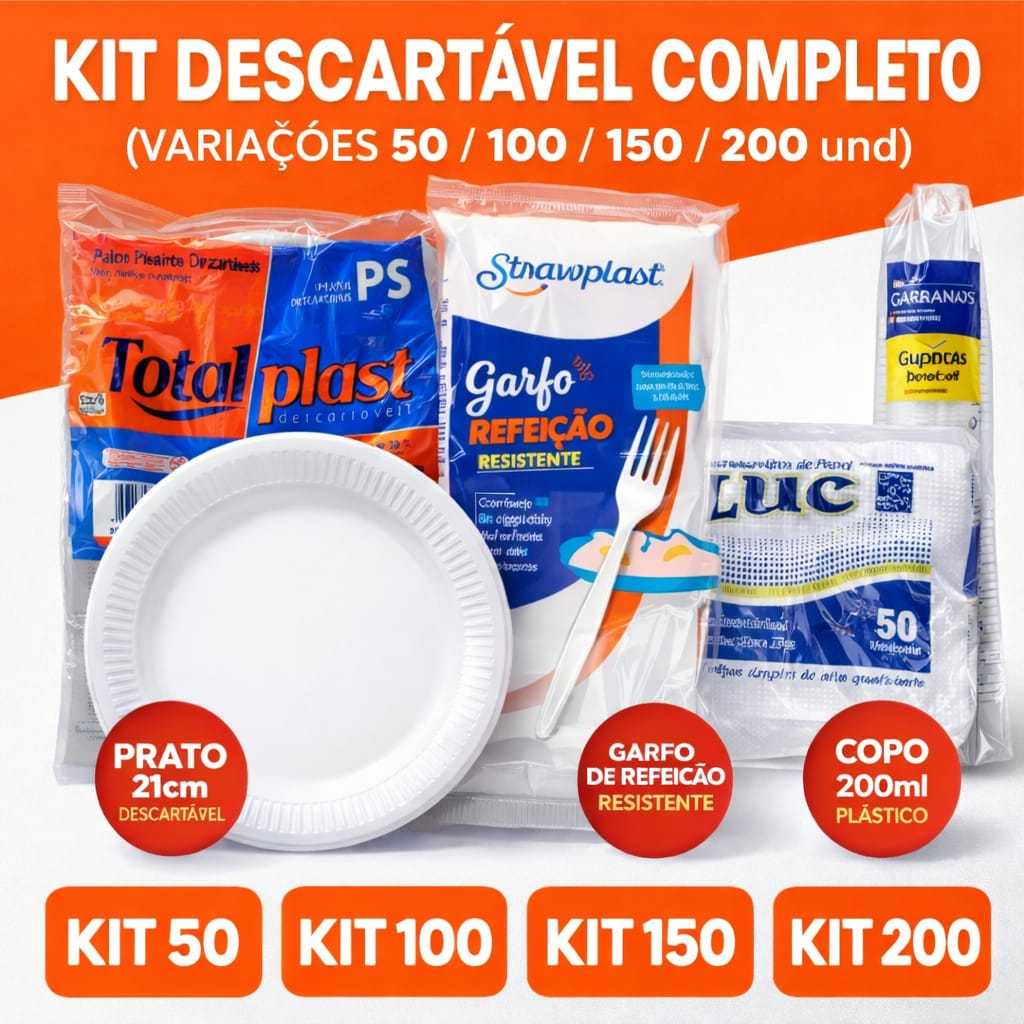 DESCRIÇÃO DO PRODUTO! O Kit Festa Descartável é a solução prática e elegante para suas comemorações. Composto por pratos rasos de 21cm, garfos de refeição e guardanapos, este kit garante conveniência e estilo para qualquer evento. Ideal para festas, piqueniques e reuniões, ele oferece a praticidade do descartável sem abrir mão do charme e funcionalidade. Simplifique a organização do seu evento com o Kit Festa Descartável! Lavar louça depois da Festa? NUNCA MAIS. KIT 1 50 pratos rasos 21cm 50 garfos resistentes de refeição 50 guardanapos 50 copos 200ml KIT 2 100 pratos rasos 21cm 100 garfos resistentes de refeição 100 guardanapos 100 copos 200ml KIT 3 150 pratos rasos 21cm 150 garfos resistentes de refeição 150 guardanapos 150 copos 200ml KIT 4 200 pratos rasos 21cm 200 garfos resistentes de refeição 200 guardanapos 200 copos 200ml Obs.: os talheres podem seguir na cor cristal ou branca, conforme disponibilidade em estoque. Sobre a entrega: • Disponível para envio imediato. • Envio em até 24 horas após a compra (Em dias úteis). • Compra segura pelo Shopee *NA FALTA DO PRODUTO DA MARCA ANUNCIADA, ENVIAREMOS MARCA SIMILIAR DE MESMA QUALIDADE E CARACTERÍSTICAS* Pós compra: • Confirmando a chegada do seu pedido você ganha MOEDAS DE DESCONTO da Shopee para serem usadas nas próximas compras. Boas compras!