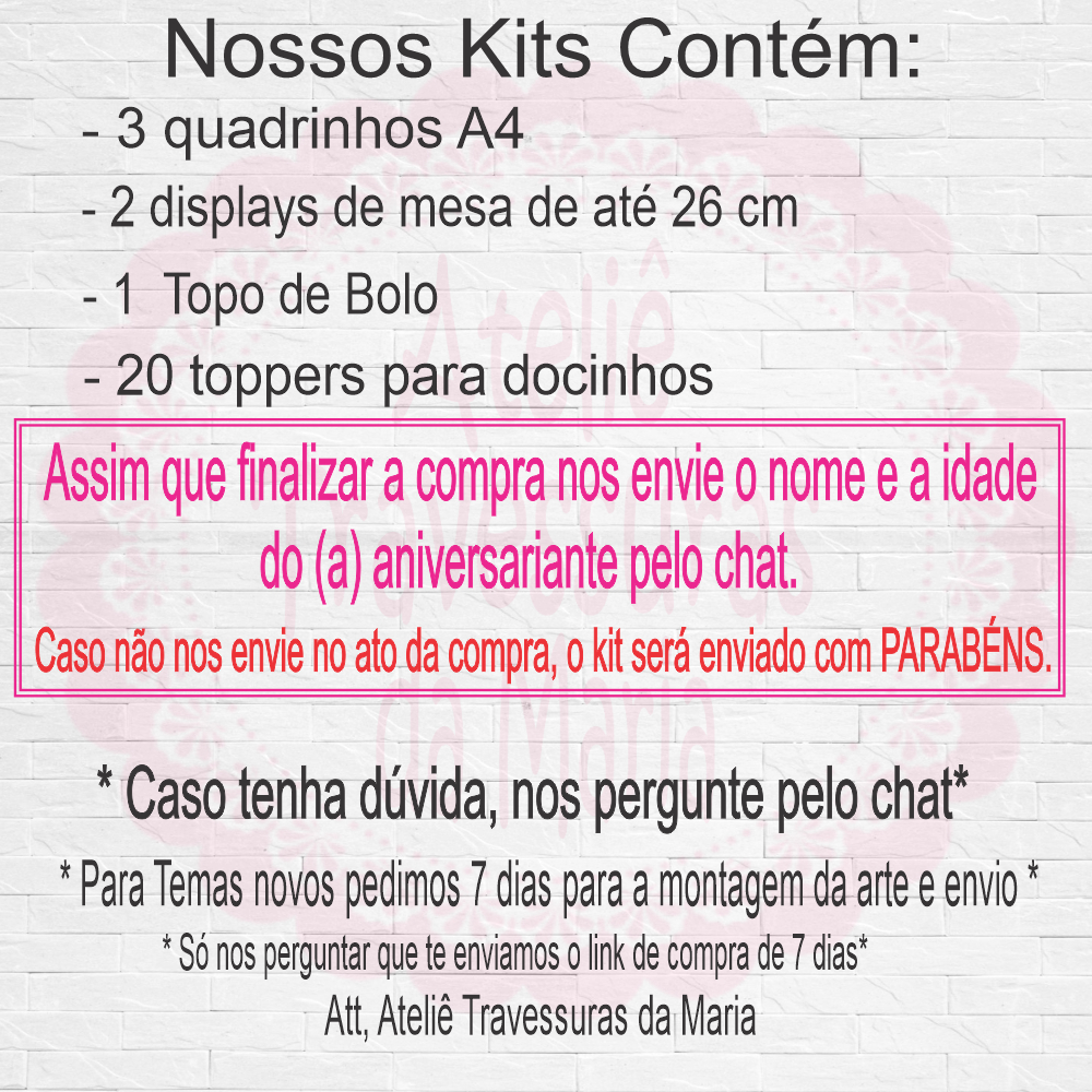 Kit Festa - Só um bolinho - Desenvolvemos todos os temas Contém: Kit 1 e 3 - 1 Topo de bolo - 2 Display de mesa - 3 Quadrinhos de parede - 20 toppers para docinho Kit 2 e 4 - 1 Topo de bolo - 2 Display de mesa - 3 Quadrinhos de parede - 1 Bandeirola (com até 10 letras / Somente o nome ou Parabéns) Não enviamos bandeirolas com desenhos para completar 10 letras. - 20 toppers para docinho Detalhes do Produto: - A personalização é feita em papel fotográfico de alto brilho à prova d'água. - Corte Feito em Máquina Profissional. ATENÇÃO!! ----------- ***** Não faremos outras alterações na arte, alterações são feitas apenas com os dados do(a) aniversariante. **** ******** As tonalidades (Cores) podem variar de acordo com as configurações de seu monitor ou celular. ******** - Não nos responsabilizamos e não devolveremos o dinheiro por atrasos dos Correios, pois nossos kits são personalizados para cada cliente ( cliente escolhe como fica a arte, sabe os tamanhos e materiais do produto). ******Utilize o campo de perguntas (CHAT) para tirar todas as sua dúvidas*********