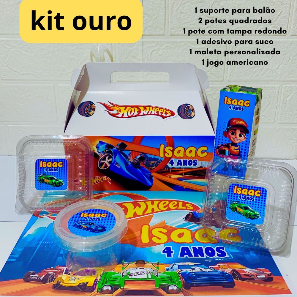 kit festa embalagem de aniversário na escola personalizada Hot wheels - kit festa escolar - caixa festa na escola 📝 LEIA ATENTAMENTE ANTES DA COMPRA! AO COMPRAR VOCÊ CONFIRMA QUE LEU TODO O ANÚNCIO E QUE ESTA DE ACORDO COM AS INFORMAÇÕES PASSADAS. **************** FAZEMOS EM VÁRIOS TEMAS (CONSULTE ANTES VIA CHAT)*************************** Para personalização com NOME E IDADE, envie as informações dentro de 24h após a compra, através do chat. Caso contrário, os personalizados serão confeccionados sem personalização do nome e idade. Vai ter festa na escola? Então deixa com agente. Esse lindo kit vai deixar a festa do seu filho ou filha, muito especial e bonita Material: Maleta branco 280g, papel fotográfico fosco, papel alta alvura fosco, haste para balões e embalagens para alimentos ⏳ PRAZO DE PRODUÇÃO: Prazo de Produção: 9 dias úteis. ⏳ PRAZO DE ENTREGA: consulte no campo "FRETE" no início do anúncio a previsão de quando você receberá o pedido. O ideal é comprar com antecedência porque não nos responsabilizamos por atrasos dos entregadores. * Não acompanha balão, docinhos, bolos ou suco! KIT OURO É COMPOSTO POR: 1 caixa lancheira personalizada (tema a escolher) 1 haste para balões com local para encaixe 2 embalagens quadradas 1 pote redondo com tampa 1 adesivo para suco de caixinha 1 jogo americano feito em papel alta alvura KIT PRATA É COMPOSTO POR: 1 caixa lancheira personalizada (tema a escolher) 2 embalagens quadradas 1 pote redondo com tampa 1 adesivo para suco de caixinha Dimensões aproximadas: Maleta: 18cm x 12cm x 22cm (AxPxC) embalagem quadrada: 400ml pote redondo 140ml jogo americano 21cm x 29cm adesivo para suco 11,5cm x 4,5cm (AxL) 🤔 AINDA TEM DÚVIDAS? Estamos aqui para te ajudar! Entre em contato pelo chat e responderemos todas as suas perguntas. 😊 Temos mais de 9 anos de experiência no ramo, trabalhando com qualidade e carinho! Deixe sua festa ainda mais linda com nossos produtos. Temos lembrancinhas e outros kits de papelaria também. ✨🎁 As cores visualizadas nos monitores ou telas podem ser 30% diferentes das cores reais. Devido a particularidades de cada monitor/tela