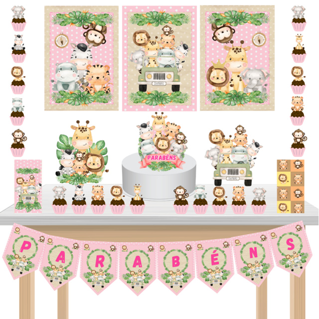 Kit Festa Fácil Kit Só Um Bolinho Safari Aquarela Rosa Mêsversário Aniversário Chá de Bebê
