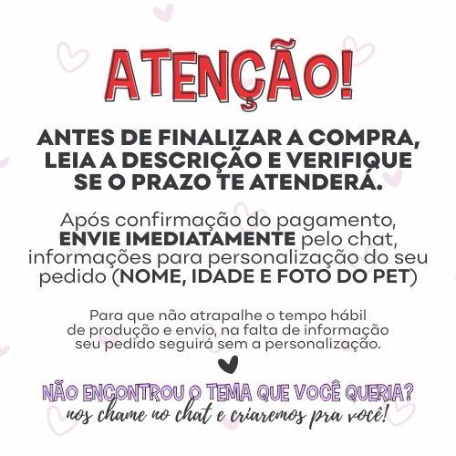 Eles fazem parte da família - e aniversário de pet também é motivo de festa! Nosso Kit Festa Fácil - Pet é a escolha perfeita para celebrar o dia do seu amiguinho de quatro patas com muito carinho, cor e diversão! Feito à mão com atenção aos mínimos detalhes e impressão de alta qualidade, o kit traz elementos fofos e personalizados que transformam qualquer cantinho em um cenário especial para fotos, petiscos e momentos inesquecíveis. O kit inclui: (SEM ADICIONAIS) Ao comprar o kit no valor base, você recebe: -1 Topo de bolo temático (pode ser usado em bolo pet ou decorativo) -1 Bandeirola personalizada com 8 bandeirolas escrito " PARABÉNS OU NOME COM ATÉ 8 LETRAS" -2 Tótens com brinquedos ou símbolos que remetem ao universo dos pets -5 Toppers para petiscos (ideais para decorar biscoitinhos ou snacks) -2 Pôsteres A4 para completar o cenário -1 Chapeuzinho de festa para o aniversariante mais fofo do mundo ✨ ADICIONAIS PERSONALIZÁVEIS (OPCIONAL) Deixe o kit do seu jeitinho! 💖 Você pode adicionar itens extras antes de finalizar a compra: 🔤 Nome com mais de 8 letras O kit inclui bandeirola com até 8 letras. Nomes maiores podem ser adicionados como adicional. 🧁 Toppers extras para docinhos O kit já vai com 5 unidades. Se quiser mais para enfeitar melhor a mesa, adicione toppers extras. 📸 Foto do pet nos toppers Os toppers de docinho podem ir com o rostinho do seu pet, deixando a decoração ainda mais fofa 🐶🐱 🐾 Foto do pet em todo o kit A foto do pet será usada em 1 poster, 2 bandeirolas , Topper de docinhos. 📌 IMPORTANTE: Os adicionais são cobrados à parte. Para incluir, selecione as opções disponíveis no anúncio antes de finalizar a compra. Porque eles merecem tudo - e a festa também! Imagens Meramente Ilustrativa Fazemos nas cores da sua festa Após a compra envie os dados para personalização dentro de 12 horas, caso contrário enviaremos sem nome para não atrasar o envio. FAZEMOS QUALQUER TEMA! 🍄🌲 ⚠️ IMPORTANTE: Envie as informações de personalização (nome) dentro de 12h após a compra. Caso contrário, o kit será enviado sem o nome. Atenção: Todos os pedidos são postados dentro do prazo combinado. Após a postagem, não nos responsabilizamos por atrasos, extravios ou problemas causados pelos Correios, pois esses fatores fogem do nosso controle. 👉 Garanta sua festa encantada com antecedência! Considere o tempo de produção e envio para que tudo chegue a tempo do evento. Cores podem variar de acordo com dispositivo usado , em caso de dúvidas entre em contato pelo chat! Será um prazer atender seu pedido. IMAGENS MERAMENTE ILUSTRATIVA Bolo fake não acompanha os ossinhos e somente o nome e idade ❌ ATENÇÃO: Por se tratar de um produto personalizado feito sob encomenda, não aceitamos devoluções ou reembolsos, conforme o Código de Defesa do Consumidor (Art. 49, §1º). Em caso de dúvidas estamos a disposição para lhe ajudar, entre em contato pelo chat e será um prazer lhe atender.