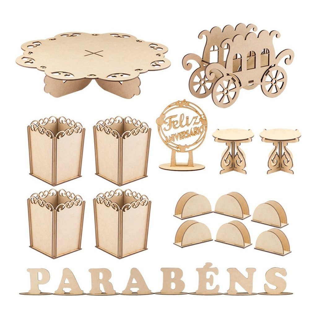 ############## PROMOÇÃO ################## SÓ HOJE A OPORTUNIDADE DE COMPRAR BARATO FESTA PROVENÇAL PRODUTOS INCLUSOS NO KIT: Trio de bandejas - 03 peças Bandeja G - Largura 26,9cm x comprimento 26,9cm x altura 4,3cm x espessura mdf 3mm Bandeja M - Largura 22cm x comprimento 22cm x altura 4,3 cm x espessura mdf 3mm Bandeja P - Largura 16cm x comprimento 16cm x altura 4,3cm x espessura mdf 3mm Árvore - Considerado 03 peças pelas bandejas Árvore Montada - Largura 40cm x altura 34cm x espessura mdf 3mm 3 Bandejas P - Largura 15cm x comprimento 15cm x altura 4,3cm x espessura mdf 3mm Trio Baleiro - Considerado 03 peças pelas bandejas Trio Baleiro Montado - altura 34,3cm x espessura mdf 3mm Bandeja G - Largura 26,9cm x comprimento 26,9cm x altura 4,3cm x espessura mdf 3mm Bandeja M - Largura 22cm x comprimento 22cm x altura 4,3 cm x espessura mdf 3mm Bandeja P - Largura 16cm x comprimento 16cm x altura 4,3cm x espessura mdf 3mm Porta Bolo - 01 peça Porto Bolo - Largura 37cm x comprimento 37cm x altura 8cm x espessura mdf 3mm Porta Tubetes - 01 peça Largura 26,9cm x comprimento 26,9cm x altura 4,3cm x espessura mdf 3mm Cachepot P - 04 peças Cachepot - Largura 11cm x comprimento 11cm x altura 13,5cm x espessura mdf 3mm Piruliteiro - 01 peça Piruliteiro – profundidade 22,5cm x comprimento 21,2cm x altura 31cm x espessura mdf 3mm Cachepot Carruagem - 01 peça Carruagem – profundidade 6,6cm x comprimento 18,2cm x altura 12cm x espessura mdf 3mm Parabéns - Considerado 08 peças Cada Letra - 09cm de altura x espessura 3mm Porta Guardanapos - 6 peças Porta Guardanapos - comprimento 9,4cm x altura 5,3cm x espessura 3mm Mesinha – comprimento 8,5cm x largura 8,5 x altura 8cm Topo de Bolo – comprimento 14,3cm x altura 19,4cm x 3mm espessura Para Diminuir os valores do frete, os produtos são enviados desmontados, A montagem é simples, só encaixar as peças e colar com cola branca para fixar, No anuncio tem um vídeo explicando como montar.