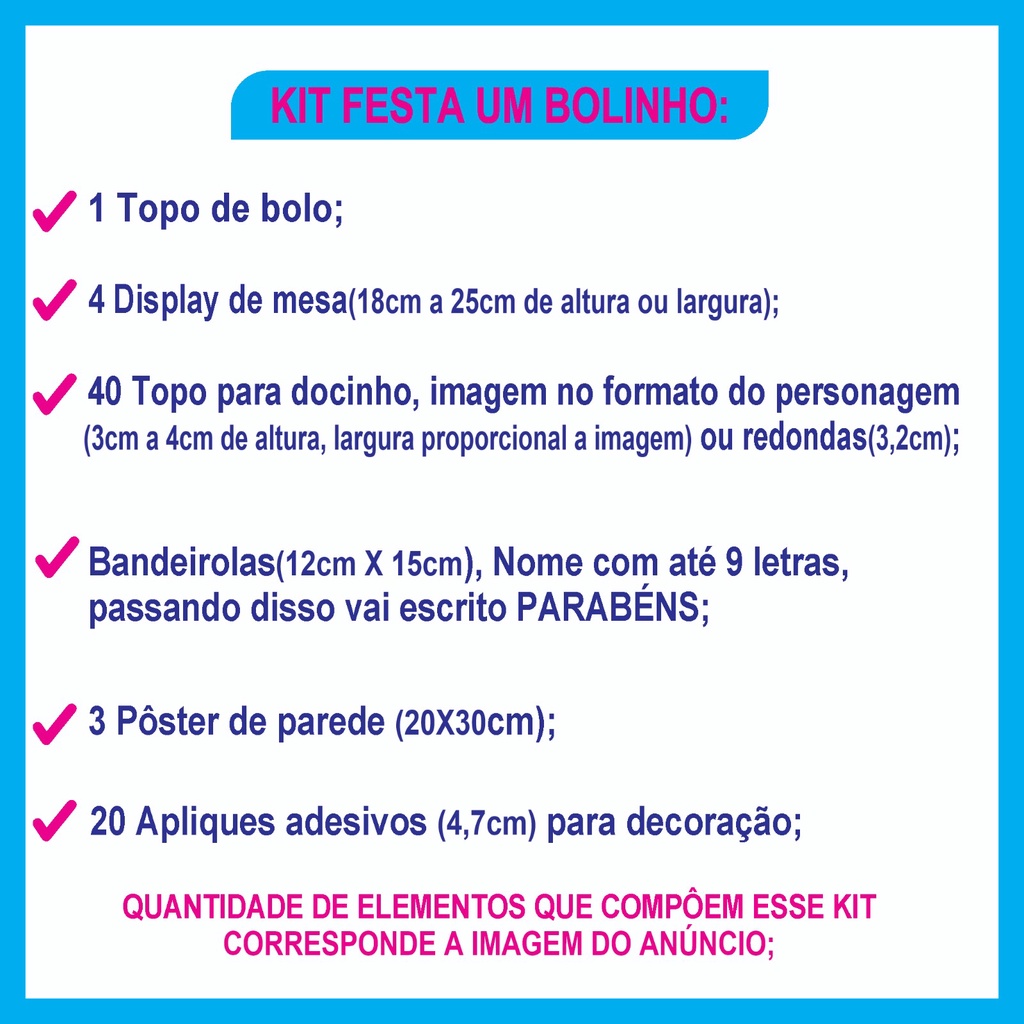 Olá tudo bem Somos a Peniel Festas e Personalizados, obg por fazer parte desse momento tão especial! **** Atenção **** *NÓS NÃO ENTRAMOS EM CONTATO PARA PEDIR OS DADOS, PQ NOSSO ENVIO É RÁPIDO,POR ISSO TEMOS TEMPO DE POSTAGEM.* Para personalização: É preciso que nos envie por meio do Chat, mensagem ao vendedor nome e idade, *é preciso enviar de imediato após a compra* pois nosso envio é rápido, caso não nos envie o dados logo após a compra irá escrito parabéns. Kit Festa só um Bolinho: •1 Topo de bolo completo (nome e idade) •Bandeirolas (com nome até 9 letras, passando vai escrito parabéns ou se desejar vai escrito parabéns) (Acompanha fitilho para pendurar) •3 Pôster medindo 20x30cm cada 4 Display de Mesa (acompanha pezinhos) •40 topo para docinhos •20 Apliques Adesivos de 4,7 cm. Composição: Papel offset 180g com alta qualidade de impressão.... TUDO CORTADO PRONTO PRA DESTACAR E MONTAR! ---------------------------------------------------------------- *Topo de Bolo e Topo de Docinhos muito fácil de fixar: (Acompanha hastes transparentes e canudo para o topo.) 1. Primeiro destaque as peças da cartela.... 2. Depois é só colar a vareta no verso de cada peça, para isso utilize uma fita adesiva, cola quente, ou cola de sua preferência.... 3. Perfure o bolo ou docinhos, decorando conforme desejar...
