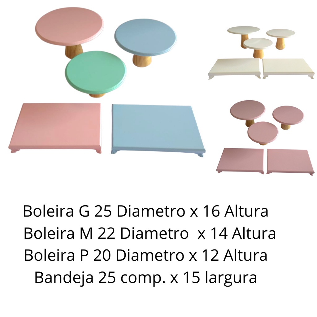Somos fabricantes de produtos em mdf cru e pintado com pintura própria desde 1998. Estamos com vendas online a poucos meses mas com grande experiência e qualidade na produção. Levando até vocês nossos queridos clientes o que há de melhor em produtos de MDF,qualidade e preço baixo. Caso tenha alguma dúvida estamos a disposição. Trio de cogumelos para suporte de doce. Pintura no tampo base agua, pé pinus torneado Medidas 1 P 20 cm de diâmetro x 12 cm de altura 1 M 23 cm de diâmetro x 14 cm de altura 1 G 25 cm de diâmetro x 16 cm de altura 2 bandejas P comprimento 25 cm x 15 cm largura