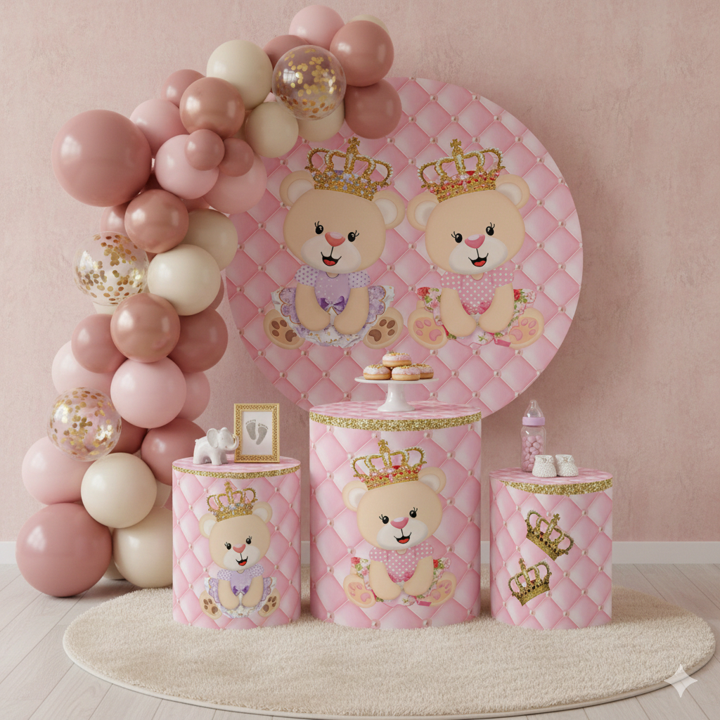Kit Festa Ursinha Realeza Decoração Infantil Completa com Capas de Painel Redondo Cilindros
