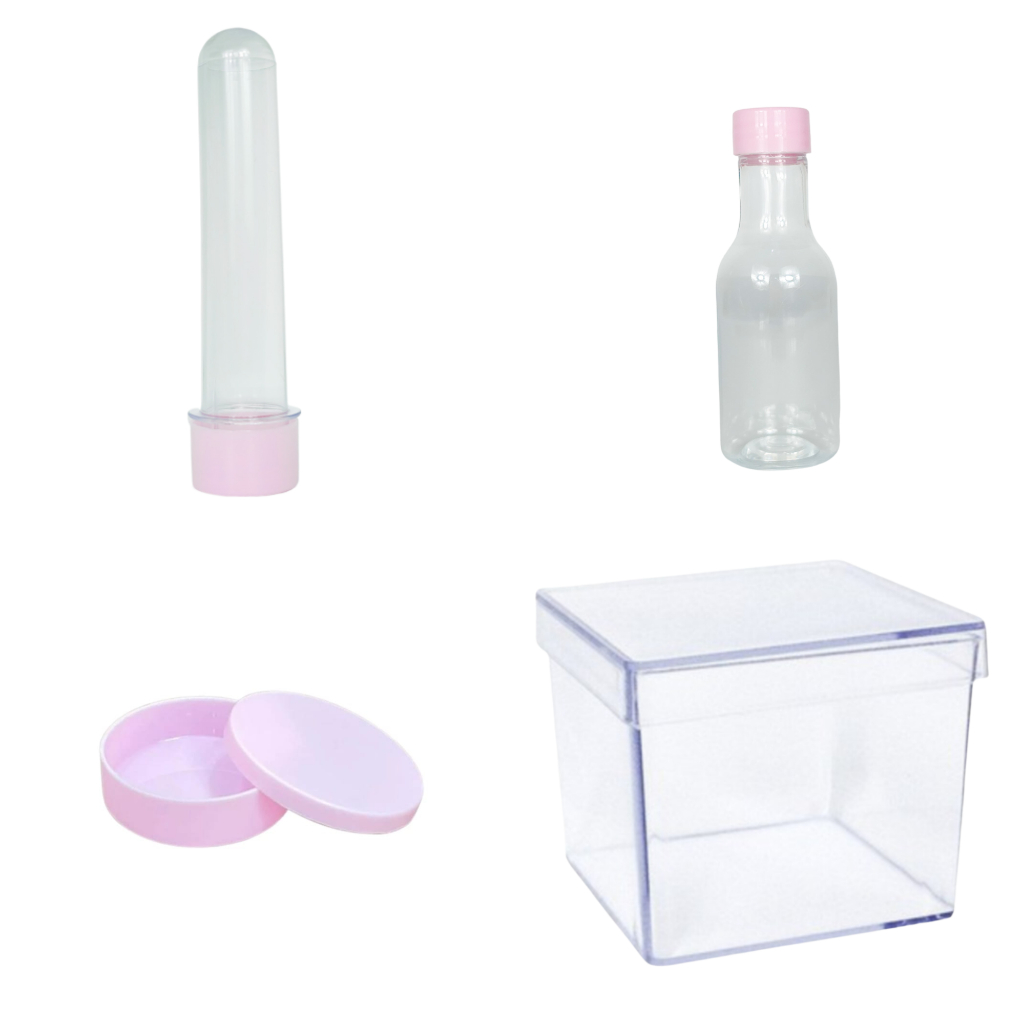 Kit Festas 10 Caixas acrilicas 5x5 10 Tubetes 13 cm 10 Latinhas 5x1 -e 10 Garrafinhas- lembrancinhas