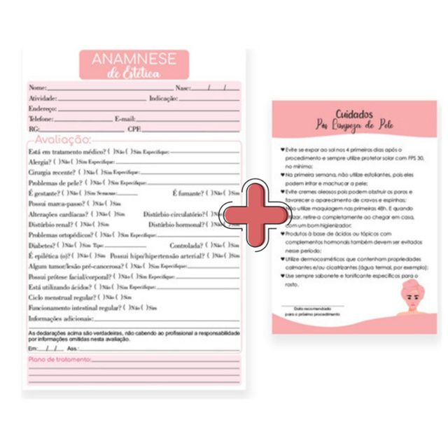 1 bloco Ficha de Anamnese com 50 folhas 1 bloco Cuidados com 50 folhas -Bloco com 100 folhas -Impressão de alta qualidade, com cores vivas -Design exclusivo e mais bonito do mercado Muito prática e vai te ajudar a poupar tempo e organizar cada atendimento. Foi desenvolvido para facilitar o seu trabalho e temos certeza de que as suas clientes irão amar receber este carinho. Bloco Anamnese com 50 folhas Tamanho: 15 x 21cm (pode variar até 1cm) Bloco Cuidados com 50 folhas Tamanho: 10 x 15cm (pode variar até 1cm)