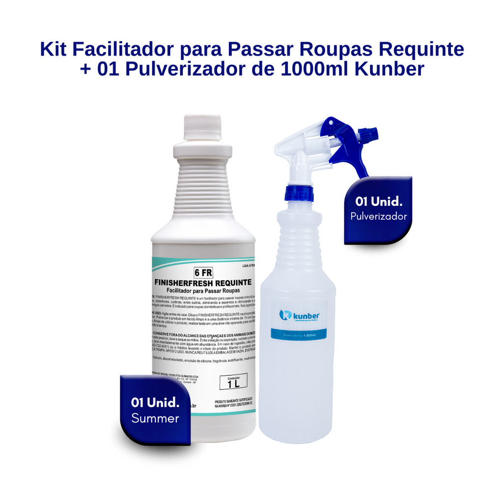 Finalizador de Roupas Finisherfresh 1L Spartan + Frasco Pulverizador 1L Kunber Facilitador para passar roupas e tecidos de fibras naturais e sintéticas presentes em toalhas, lençóis, edredons, cobertores, cortinas, entre outros, eliminando a aspereza e otimizando o efeito de passadoria, deixando os tecidos macios e perfumados por longos períodos. É indicado para roupas domésticas e profissionais. Sua fragrância resiste a altas temperaturas. PH: 6,0 / Diluição: até 1:10 / Fragrância: Bouquet, Summer ou Requinte (à escolher) / Embalagem: 01 unidade de 1L Acompanha o frasco com pulverizador. Produto versátil que pode ser utilizado para os mais variados fins. É resistente para carregar soluções de limpeza como álcool, detergentes, limpa vidros, desinfetantes, sanitizantes e limpadores gerais. Frasco redondo pulverizador na cor translucido. Capacidade 1 Litro + Gatilho Spray pulverizador na cor azul