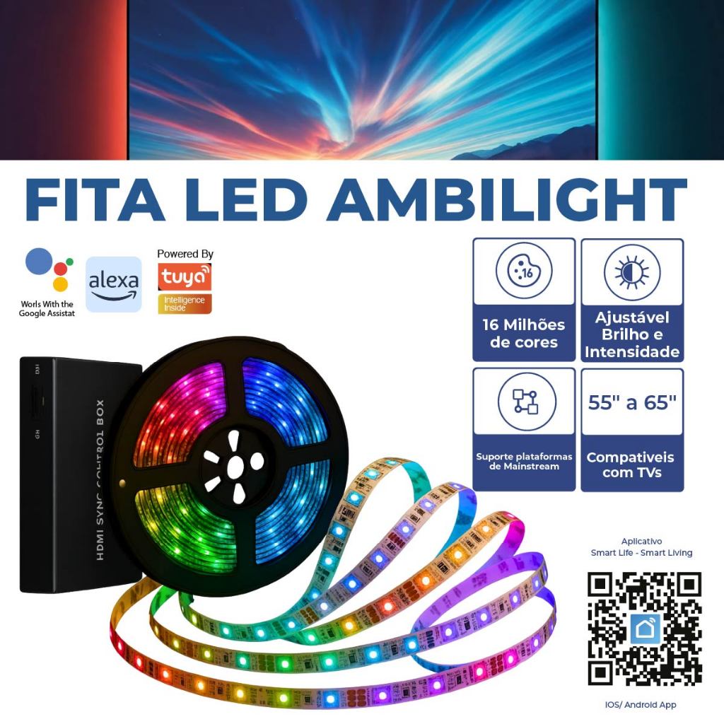 Kit Fita LED Ambilight TV Wi-Fi GMART RGB – 55 a 65” | Alexa • Tuya Transforme sua TV em um verdadeiro cinema em casa. O Kit Fita LED Ambilight GMART cria uma iluminação dinâmica que acompanha o conteúdo da tela, aumentando a imersão em filmes, séries, jogos e esportes. Tecnologia atual, instalação simples e resultado de impacto. ⚠️ IMPORTANTE Compatível exclusivamente com TVs de 55 a 65 polegadas Não pode ser cortada Para o efeito Ambilight funcionar, é necessário dispositivo externo com HDMI 2.0 (ex.: Fire Stick, TV Box, Playstation 4) Principais Benefícios 🎬 Experiência Imersiva Real As cores da fita LED sincronizam com a imagem da tela, criando efeito cinematográfico. 📱 Controle Inteligente via Wi-Fi Ajuste cores, brilho e modos pelo aplicativo. 🗣️ Compatível com Alexa e App Tuya 🌈 RGB Multicolorido Milhares de cores e efeitos personalizáveis. ⚡ Baixo Consumo de Energia 🔧 Instalação Fácil Fita autoadesiva forte, sem necessidade de ferramentas. Especificações Técnicas Modelo: CLW-STV Compatibilidade: TVs de 55 a 65 polegadas Comprimento da fita: 5 metros Cor da luz: RGB Conectividade: Wi-Fi 2.4GHz Controle: Aplicativo + comando de voz Voltagem: 110V / 220V (Bivolt) Corrente nominal: 2A Carga máxima: 440W Material: Plástico flexível de alta resistência Resolução suportada: 3840×2160 / 4096×2160 – 60fps Taxa de atualização máxima: 240Hz @ 1080p HDR: HDR10 / HLG / Dolby Vision Conteúdo da Embalagem 1× Controlador de Fita LED 1× Fita LED Ambilight 1× Fonte de Alimentação 1× Cabo HDMI 6× Clipes de Fixação 1× Manual do Usuário Requisitos de Rede (Importante) Para melhor desempenho, recomenda-se rede Wi-Fi estável, preferencialmente sistema Mesh, garantindo: Conexão contínua Resposta rápida aos comandos Melhor sincronização de cores 💡 Resultado: mais imersão, mais impacto visual e um setup muito mais moderno. Instalou, ligou, impressionou.