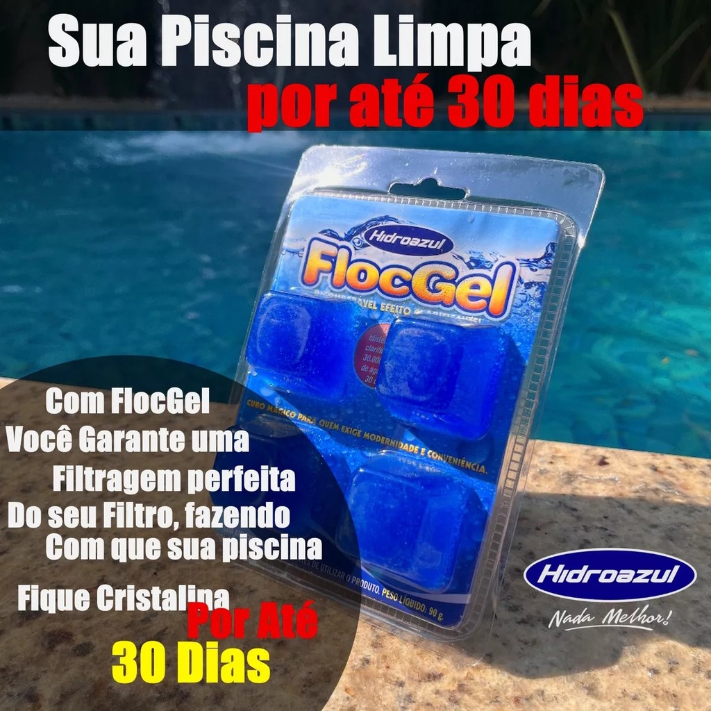 Floc gel 4 cubos hidroazul - 90g é um produto em gel, 100% poliacrilamida, que atua atraindo e aglomerando micropartículas, removendo assim as impurezas que não são removidas por filtração ou decantação por serem muito pequenas. Aumenta a eficiência do filtro, deixando a água cristalina. Instruções de uso A alcalinidade total da água deve estar entre 80 e 120 ppm e o pH entre 7,4 e 7,6. Se necessário, faça a correção. Faça uma retrolavagem no filtro (lavar), seguida da pré-filtragem (enxaguar) e coloque um cubo na cesta do filtro ou skimmer e, se necessário, faça uma limpeza, retirando as folhas e impurezas. Filtrar por um período mínimo de 6 horas, ou de acordo com a indicação do fabricante do filtro. Reponha quando necessário. Ficha técnica Produto : clarificante floc gel Substância química: gel de poliacrilamida Aparência: gelatinoso Cor: azul Cuidados e instruções : Mantenha fora do alcance das crianças e animais.