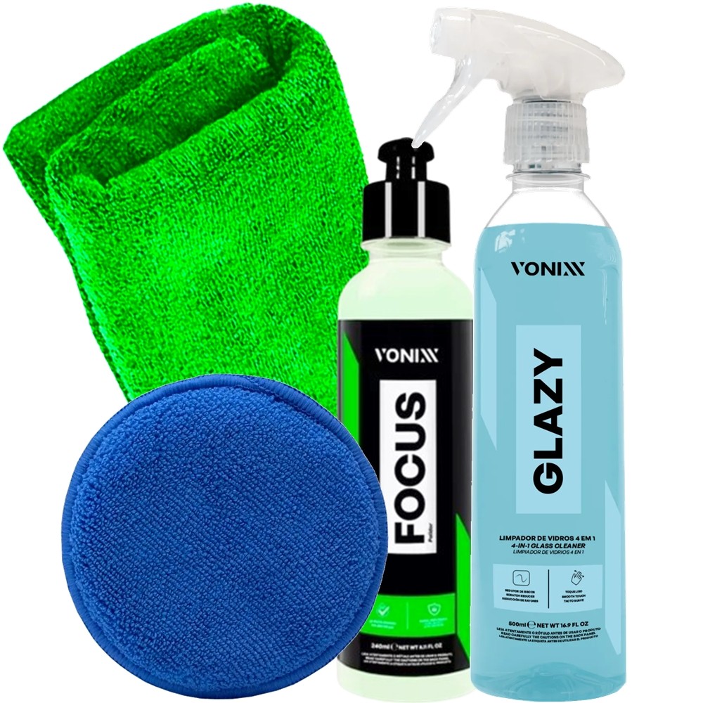 Kit Focus Vonixx Remoção de Manchas de Vidros Espelhos Box Banheiro Não Mancha + Limpador Glazy Aplicador e Toalha