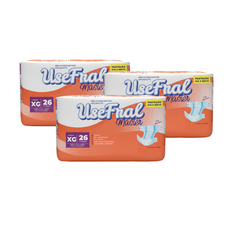 PACOTÃO DE FRALDAS Usefral Master CONFORTI! Fraldas Direto De Fabrica Fraldas Geriátricas direto da fábrica com preços imbatíveis e qualidade excepcional! Fraldas para adultos! Feita para incontinência urinária! Ideais para o uso prolongado devido ao gel super-absorvente aplicado em camadas, formato anatômico. Proporcionando maior conforto, discrição e suavidade e Com Cheirinho De Aloe vera. 1) Dermatologicamente testada. 2) Barreiras antivazamento 3) Nova Camada Protetora 4) Indicador de Umidade 5) Fitas Adesivas Largas e Reposicionáveis 6) Cobertura Filtrante Suave Registro no Ministério da Saúde: “DISPENSADO DE REGISTRO NO MINISTÉRIO DA SAÚDE. Aguardamos Sua Compra :)