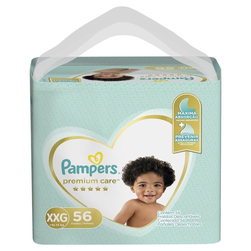 O Kit contém: 2 pacotes de Fraldas Pampers Premium Care Jumbo Tamanho XXG com 56 unidades cada. Pampers Premium Care , nossa proteção mais suave para a sua pele. É suave como o algodão e ultra respirável. Também tem canais de ar para uma pele seca e arejada, e uma loção hipoalergênica exclusiva que ajuda a prevenir irritações. Suave como algodão: a proteção mais suave da Pampers Canais de Ar: para uma pele arejada e sequinha Loção hipoalergênica exclusiva: ajuda a prevenir irritações Incrível sistema de absorção que oferece até 12 horas de sono sequinho** Ajuste cômodo e flexível: esticam e se ajustam aos movimentos do seu bebê Barreiras anti-derrames *Compre produtos Pampers
