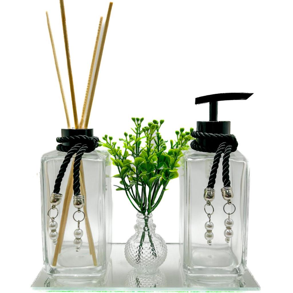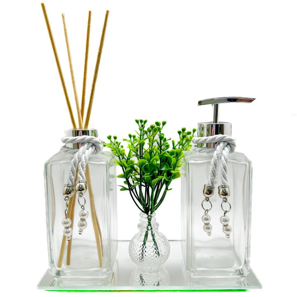 Kit Frascos de Vidro Para Lavabo Luxo Cristal Difusor de Ambiente, Saboneteira, Bandeja, Vaso Com Folhagem e Varetas