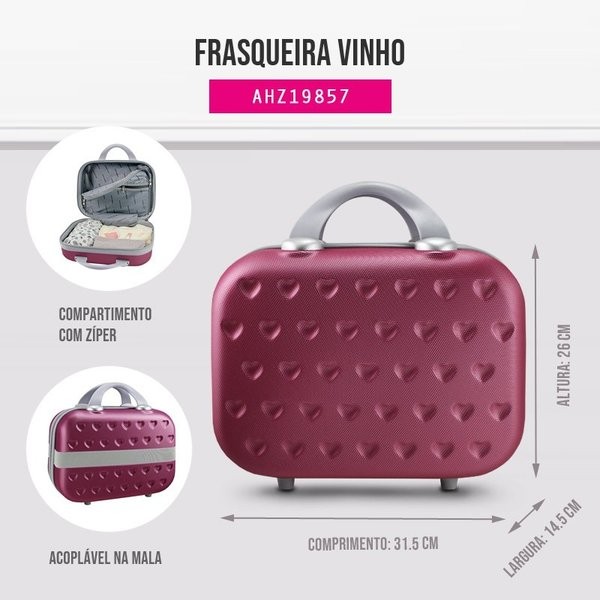 Kit de Viagem Completo Jacki Design: Organização, Praticidade e Estilo em Cada Detalhe Leve sua rotina de cuidados para onde for com o nosso Kit de Viagem Jacki Design, uma solução inteligente e elegante que reúne tudo o que você precisa para transportar seus cosméticos, documentos e acessórios pequenos com segurança e facilidade. Conteúdo do Kit: Frasqueira F.Permissionay Jacki Design: Confeccionada em policarbonato e ABS resistente, com amplo espaço interno, divisórias organizadoras e sistema de alça carona para encaixar no carrinho da mala — perfeita para maquiagem, documentos e acessórios pequenos. Medidas: 31,5cm x 14,5cm x 26cm. Necessaire Rocambole Coleção Premium: Uma charmosa companhia com quatro compartimentos internos revestidos com PVC transparente, facilitando a visualização e limpeza. Fabricada em microfibra de alta qualidade, ideal para itens de higiene e cosméticos. Medidas: 22cm x 9cm x 9cm. Kit de Frascos para Viagem (10 peças): Necessaire transparente à prova d’água com frascos, potes e acessórios para transportar líquidos, cremes e sólidos. Compacto, resistente e reutilizável, tudo dentro das medidas permitidas para bagagem de mão. Por que escolher nosso kit? Produtos originais Jacki Design, de alta qualidade e durabilidade. Organização eficiente, facilitando o acesso aos itens essenciais. Design moderno e compacto, perfeito para viagens nacionais e internacionais. Embalado com cuidado e enviado rapidamente para você. Garantia de 3 meses para sua tranquilidade. Transforme sua experiência de viagem com nosso conjunto completo — praticidade, segurança e estilo em cada detalhe. Viaje com confiança e organização, leve tudo o que precisa com facilidade! Acompanha o produto: • frasqueira necessaire frascos