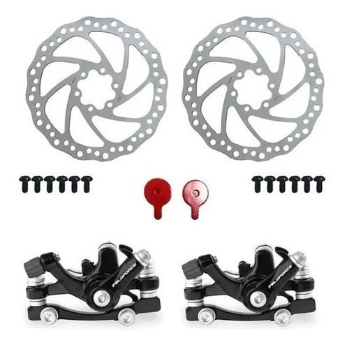 1 - kit Freios Mecanico Absolute 1 - Par de Alavancas Rapdifire 24 velocidades Gts Ou Yamada ESPECIFICAÇÕES DOS PRODUTOS Freio a disco de alumínio dianteiro e traseiro 02 Pinças de freio; 02 Disco 160mm; 04 parafusos Allen de fixação da pinça; 12 parafusos Allen p/ fixar disco; Composição: pinça de alumínio e disco 160mm de aço; Marca: Absolute Alavanca Rapid Fire 24m com maçaneta de freio em Aluminio; Modelo: 24 Velocidades v-fire; Composição: Aluminio
