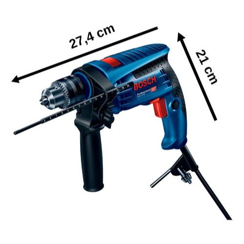 Furadeira de Impacto Bosch GSB 13 RE 750W em Maleta + Kit de Pontas, Brocas e Serra Copo 103 Peças Com Maleta. A nova Furadeira de Impacto Bosch GSB 13 RE possui 750W de potência, é super leve e compacta! Vem com empunhadeira emborrachada para o agarre seguro e confortável. Além disso, possui interruptor de velocidade variável e botão trava para trabalhos contínuos. Interruptor com velocidade variável e botão-trava para trabalhos contínuos. Motor de alto desempenho de 750 W para atender a todas as necessidades dos usuários. Empunhadeira emborrachada: agarre seguro e confortável. 40% mais rápida que os concorrentes nas perfurações e 3X mais durável; Público Alvo: Pedreiros, marceneiros, carpinteiros, instaladores em geral, vidraceiros, oficinas de manutenção, serralheiros, eletricistas, calheiros; Uso industrial com 2 anos de garantia. Características: - Modelo Bosch Heavy Duty; - Possui velocidade variável; - Acabamento da ferramenta: Poliamida, metal e elastômero; - Acabamento do cabo: Borracha, cobre; - Comprimento do cabo: 2 metros; - Tipo de embalagem: maleta plástica; - Material de aplicação indicado: Perfurações em concreto, alvenaria, madeira e metal com e sem impacto. Especificações Técnicas: - Cor: Azul; - Tensão: 110 V ou 220 V (não é bivolt); - Potência nominal absorvida: 750 W; - Nº de rotações em vazio: 0 - 3.150 rpm; - Torque nominal: 1,8 Nm; - Mandril: 1/2"– 20 UNF (13 mm); - Tipo de mandril: Com chave; - Amplitude de aperto: 1,5 mm - 13 mm; - Impacto por minuto: 0-47.250 ipm; - Altura: 21cm; - Largura: 7cm; - Comprimento: 27,4cm; - Peso: 1,8 kg. Faixa de Perfuração: - Diâmetro de perfuração em concreto: 13 mm; - Diâmetro de perfuração em madeira: 25 mm; - Diâmetro de perfuração em aço: 10 mm; - Diâmetro de perfuração em alvenaria: 15 mm. Valores Totais de Vibração - Perfurar Metal: - Valor de emissão de vibrações ah: 3 m/s²; - Incerteza k: 1,5 m/s². Valores Totais de Vibração - Perfurar Concreto: - Valor de emissão de vibrações ah: 26 m/s²; - Incerteza k: 3 m/s². Valores Totais de Vibração - Parafusar: - Valor de emissão de vibrações ah: 2,5 m/s²; - Incerteza k: 1,5 m/s². Itens Inclusos: - 1 Furadeira de impacto GSB 13 RE; - 1 Limitador de profundidade; - 1 Chave de mandril; - 1 Empunhadeira auxiliar; - 1 Maleta de transporte; - 1 Manual de instruções. Kit de Pontas, Brocas e Serra Copo 103 Peças Com Maleta: O jogo completo que você precisa ter em casa! Contém 103 peças, entre brocas, pontas, aparafusadoras e ferramentas auxiliares. Acompanha uma maleta plástica com espaço para cada peça, ideal para armazenar e transportar quando necessário. Compatível com todas as superfícies, as peças são feitas em aço e podem ser usadas em furadeiras e parafusadeiras manuais e elétricas. Especificações: • Tipo: Conjunto • Recomendado para uso: Doméstico ou Profissional • Aplicação: Todas as superfícies • Número de Peças: 103 • Compatível com: Furadeiras e parafusadeiras elétricas ou manuais • Itens que compõem o Kit: - 19 Brocas para metal: 1.5-1.5-2-2-2-2.5-3-3-3-3-3.2-3.5-4-4.5-4.8-5-5.5-6.0-7mm; - 05 Brocas para concreto: 4-5-6-8-10mm; - 09 Brocas para madeira: 3-3-4-4-5-6-7-8-10mm; - 02 Brocas chatas para madeira: 16-22mm; - 40 Pontas de bits para aparafusamento 25mm em CRV6150 (aço cromo-vanádio: ** 11 pçs Fenda: 3-3-4-4-5-5-5.5-5.5-6-6-7mm; ** 8 pçs Phillips: 2xPH1, 4xPH2, 2xPH3; ** 8 pçs Pozidriv (Pozi): 2xPZ1, 4xPZ2, 2xPZ3; ** 7 pçs Torx (Estrela): T10, T15, T20, T25, T27, T30, T40; ** 3 pçs Quadrada: S1, S2, S3; ** 3 pçs Hexagonal: H4, H5, H6; - 13 Pontas bits longos para aparafusamento; - 07 Pontas de soquete (tipo chave canhão): 5-6-8-10-11-12-13mm; - 04 Serras copo: 32-38-44-54mm; - 01 Adaptador de serra copo; - 01 Chave alien; - 01 Suporte magnético; - 01 Escareador; Dimensões: • Altura do Produto (mm): 210 • Largura do Produto (mm): 310 • Profundidade do Produto (mm): 55mm • Peso(kg): 1,60; • Conteúdo da Embalagem: - 01 Jogo com 103 peças em maleta plástica. Cód. Bosch GSB13RE: 110v 060123D5D2 / 220v 060123D5E2 Ficou alguma dúvida? Faça sua pergunta, ficaremos satisfeitos em lhe atender bem. Emitimos Nota Fiscal. Qualidade, preço Justo e atendimento Perfeito.