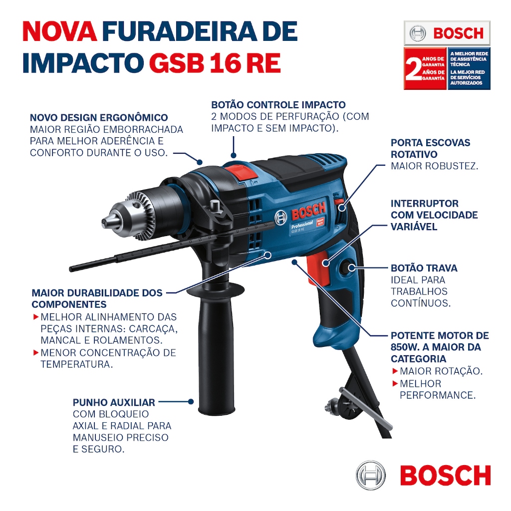 Kit com a nova Furadeira de Impacto Bosch GSB 16 RE agora com 850W de potência e Kit Brocas Pontas/Bits Bosch com 33 peças. =====PRODUTO NA TENSÃO DE 220V===== Sua carcaça robusta tipo pote garante maior durabilidade e vida útil da ferramenta. Recomendada para uso industrial. Trabalho continuo. Robusta carcaça de engrenagem tipo pote: maior vida útil e durabilidade do produto. Punho auxiliar com bloqueio axial e radial: manuseio preciso e seguro. Informações Técnicas: Modelo: GSB 16 RE Potência: 850 W Nº de rotações em vazio, 1ª velocidade: 0 – 3.250 r.p.m. Nº máx. de impactos em vazio: 0 – 48.500 i.p.m. Torque nominal: 2,1 Nm Amplitude de aperto, min./máx.: 1,5 – 13 mm Diâmetro de perfuração em concreto: 16 mm Diâmetro de perfuração em madeira: 25 mm Diâmetro de perfuração em aço: 12 mm Garantia de 2 anos do fabricante. Itens Inclusos: - 1 Maleta; - 1 Empunhadeira lateral; - 1 Medidor de profundidade. A tecnologia da Bosch molda muitas áreas da sua vida. A garantia de sucesso da empresa baseia-se na sustentabilidade, o que garante o crescimento a longo prazo e, ao mesmo tempo, a proteção ambiental. As furadeiras da Bosch são multi-talentosas para as aplicações mais versáteis e foram projetadas para atender às mais altas demandas em termos de potência e vida útil. Desfrute do máximo controle e precisão em uma ampla variedade de materiais. Esta ferramenta é muito resistente e é capaz de lidar com as aplicações mais complexas no local de trabalho. A Bosch Professional caracteriza-se por um design compacto que proporciona um manuseio ideal e a torna na ferramenta perfeita para trabalhar em altura e em espaços apertados. Tecnologia de excelência Seu mandril de 13 mm permitirá que você manipule facilmente a ferramenta com segurança e precisão. Além disso, sua velocidade variável oferece uma grande experiência de uso, adaptada às suas necessidades e seus requerimentos. Versatilidade e eficiência Use-o para as aplicações que você desejar. Sendo um martelo e parafusadeira, você poderá explorar ao máximo as suas funções e obter precisão e qualidade. Jogo de Brocas X-Line: Conta com 33 peças feitas em material resistente, oferecendo maior durabilidade. As peças são acondicionadas em maleta plástica com visor transparente e compartimento para cada item, permitindo organização e praticidade. Indicado para operações diversas com madeira, metal e concreto. Conteúdo do kit: - 7 brocas para metal HSS-R de 2/3/3/3,2/4/4,2/5 mm - 5 brocas para pedra de 4/5/6/7/8 mm - 6 brocas para madeira de 3/4/5/6/7/8 mm - 10 bits, C = 25 mm, PH 1/2/3, PZ 1/2, SL 4/6/7, T 20/25 - 1 suporte universal magnético - 3 chaves de caixa para parafusos sextavados 7/8/10 mm - 1 escareador Especificações técnicas: - Madeira diâmetro 3-8 mm - Pedra diâmetro 4-8 mm - Metal diâmetro 2-5 mm - Altura: 4,90 - Largura: 14,80 - Comprimento: 17,00 - Peso (kg): 0,53 Cód. Bosch GSB16RE: 110v 06012B90D1 / 220v 06012B90E1 Cód. Bosch Kit Brocas: 2607017398 Ficou alguma dúvida? Faça sua pergunta, ficaremos satisfeitos em lhe atender bem. Emitimos Nota Fiscal. Qualidade, preço Justo e atendimento Perfeito.