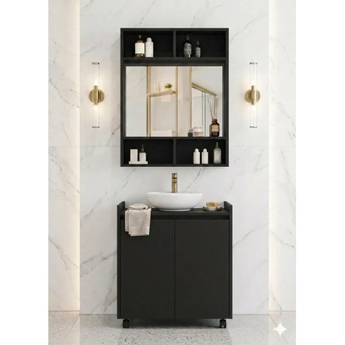 Kit Gabinete De Coluna 2 Porta Banheiro Com Armario Espelheira Nicho Preto