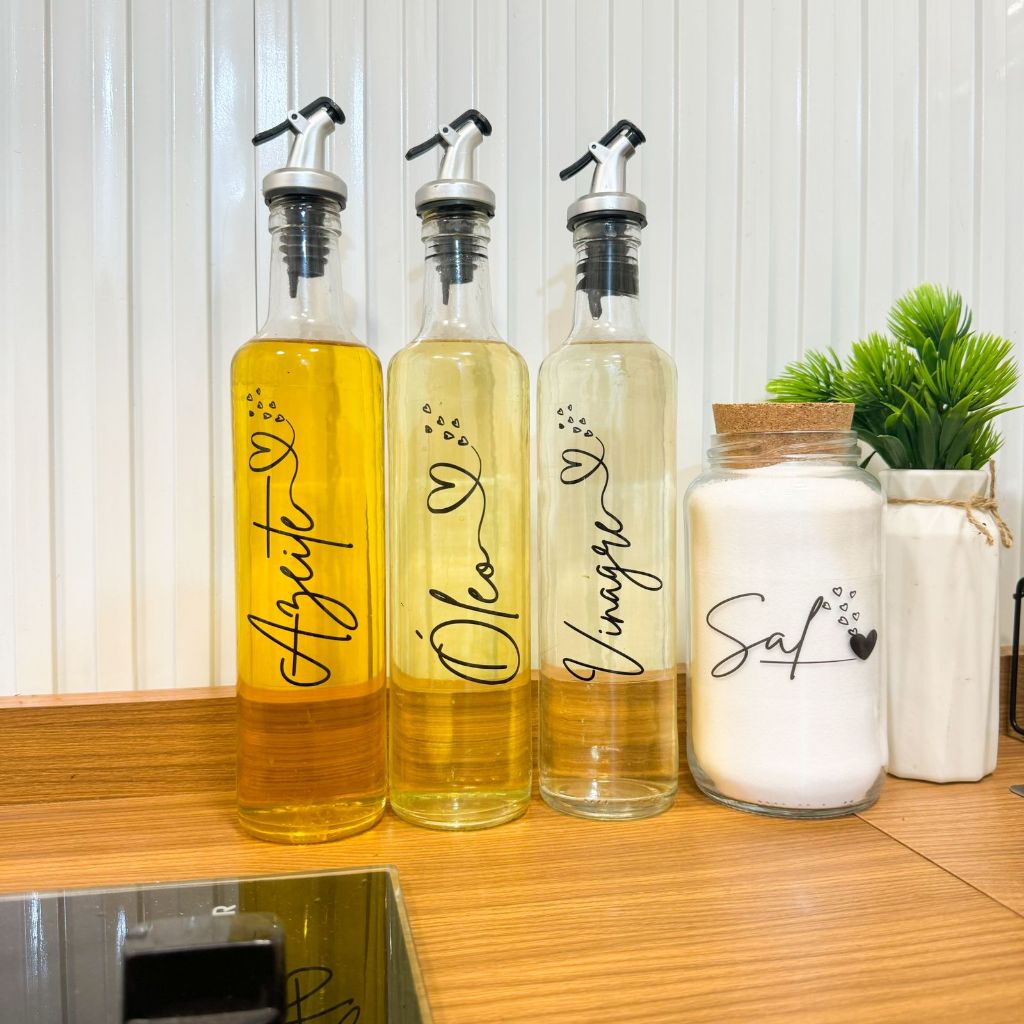 Mantenha sua cozinha organizada e decorada com os nosso kit cantinho dos temperos kit galheteiro com 4 peças para óleo, azeite, vinagre e sal com bico dosador click ou simples Disponível também avulso. Funcional Design moderno Etiquetas à prova d'água Não mancham Não descolam Capacidade das garrafas: 525 ml Tamanho: Altura: 26 cm Diametro: 6.5 cm Material: vidro Capacidade da porta-tempero para sal: 500g Tamanho: Altura: 16.5 cm Diametro: 8.5 cm Material: vidro