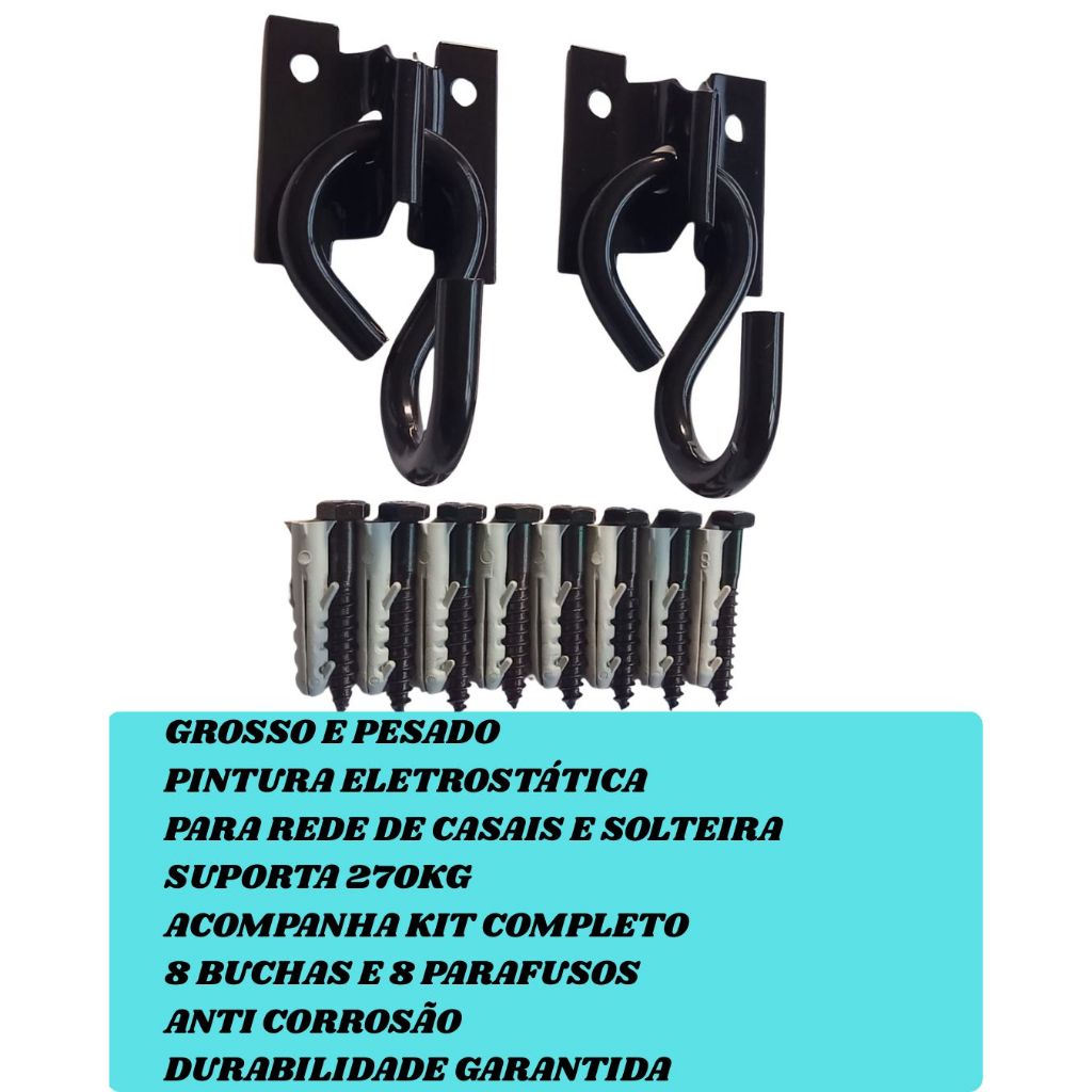 Kit completo para instalação, de alta resistência. Esta peça tem um acabamento com resistência contra a corrosão e maior durabilidade. É resistente ao peso, suportando até 250 Kg e às mudanças climáticas, o que garante um uso prolongado. Além disso, é fácil de instalar. DETALHES: - Aço PINTURA ELETROSTÁTICA - Suporta até 270kg. - Anti corrosão (ótimo para regiões litorâneas) TIPOS DE INSTALAÇÕES: - Parede de Alvenaria/Concretada/ blocos - Pilares/Vigas de Madeiras - Ideal para redes de balanço e descanso- O KIT ACOMPANHA: 2 Ganchos de aço com acabamento em pintura ELETROSTÁTICA - 8 Parafusos sextavados que garantem maior resistência; - 8 Buchas 8mm para maior segurança;