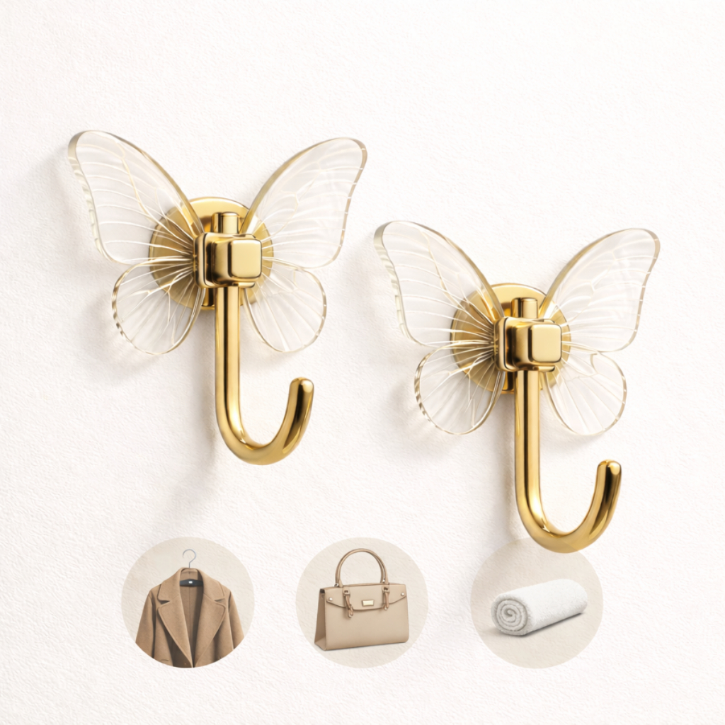 1 KIT = 2 GANCHOS 2 KITS = 4 GANCHOS 3 KITS = 6 GANCHOS 4 KITS = 8 GANCHOS 5 KITS = 10 GANCHOS Kit com 2 ganchos em formato de borboleta produzidos em acrílico. Tamanho: 8 cm de largura x 7,8 cm de comprimento. Design decorativo, resistente e fácil de aplicar. Recomendações de Uso Não é recomendado para itens frágeis como espelhos, vidros ou aparelhos eletrônicos. Instale sempre em superfícies lisas e limpas. Evite o uso em locais úmidos ou com calor excessivo. Instruções de Instalação Certifique-se de que a superfície esteja limpa e seca. Retire a película protetora com cuidado. Pressione o gancho contra a superfície por 15 segundos. Para melhor fixação, aguarde 12 horas antes de utilizar.