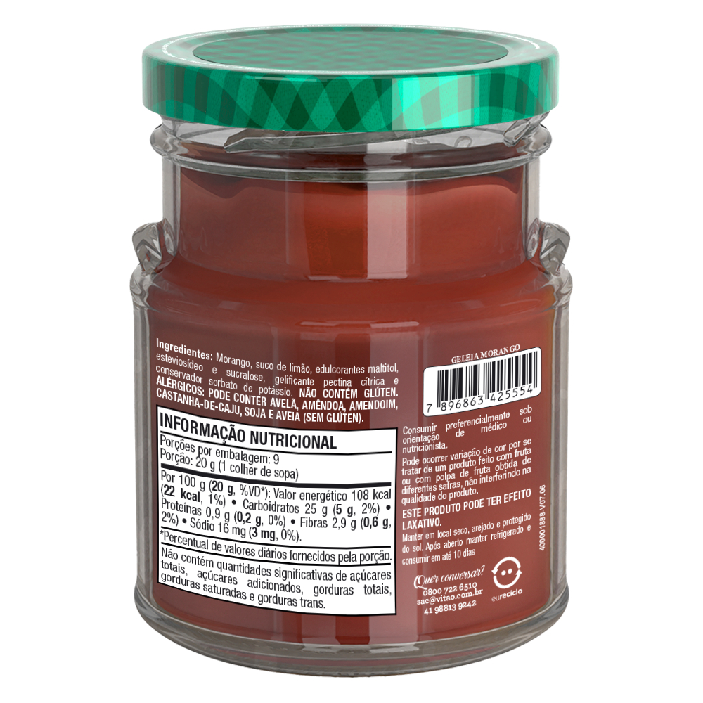 A geleia de morango sem adição de açúcares da Vitao foi especialmente desenvolvida para atender às necessidades do público que segue dietas restritivas de açúcar e glúten, assim como para aqueles que procuram manter um estilo de vida saudável com uma alimentação equilibrada, sem abrir mão do sabor. Pode ser apreciada pura, acompanhando pães, panquecas, torradas e outros alimentos, ou até mesmo utilizada como recheio em bolos, tortas e diversas sobremesas. Seu sabor delicioso e sua versatilidade a tornam uma opção perfeita para desfrutar de uma alternativa saudável e saborosa em qualquer momento. INGREDIENTES: Morango, suco de limão, edulcorantes de xarope de maltitol, glicosídeos de esteviol de Stevia rebaudiana Bertoni e sucralose, gelificante pectina cítrica e conservador sorbato de potássio. ALÉRGICOS: PODE CONTER AVELÃ, AMÊNDOA, CASTANHA-DE-CAJU, CASTANHA-DO-PARÁ, SOJA E AVEIA (SEM GLÚTEN). DIABÉTICOS: CONTÉM GLICOSE E FRUTOSE NÃO CONTÉM GLÚTEN. SEM GLÚTEN, ZERO ADIÇÃO DE AÇÚCARES.
