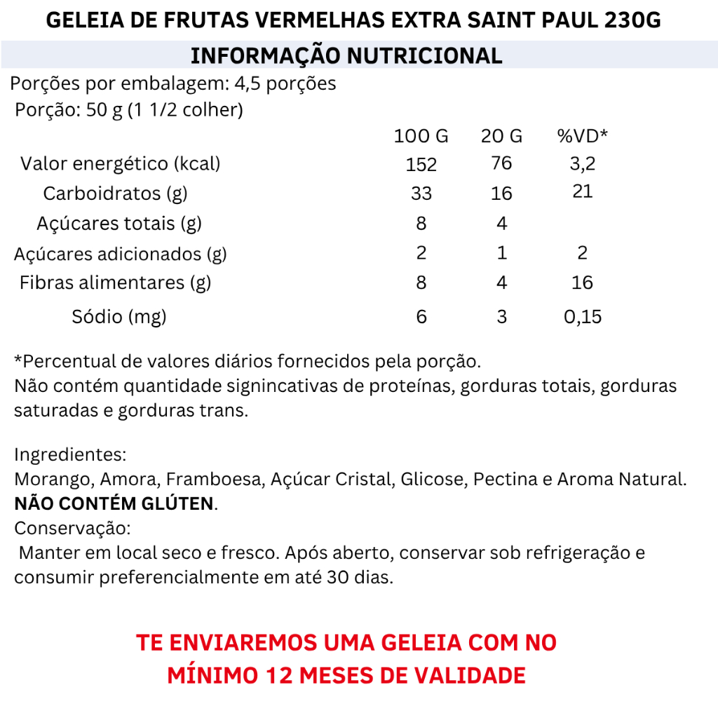 KIT Geleias Saint Paul – Sabores Intensos em Cada Pote de 230g Explore o melhor das geleias Saint Paul com um kit especial que combina sabores marcantes, textura aveludada e uma apresentação charmosa. Perfeito para quem valoriza qualidade e sabor no café da manhã, lanche ou sobremesa. 🍓 Geleia de Frutas Vermelhas Uma combinação deliciosa de morango, framboesa e amora, com sabor equilibrado e marcante. Ideal para acompanhar pães, queijos e sobremesas. 🍊 Geleia de Tangerina Cítrica e aromática, surpreende com seu sabor fresco e levemente adocicado. Um toque especial que transforma receitas simples em experiências saborosas. 🍈 Geleia de Damasco Suave e levemente ácida, destaca-se pelo sabor delicado e pela textura cremosa que combina com tudo. Por que escolher o Kit Saint Paul: 🍯 Textura Aveludada: Fácil de espalhar, perfeita para pães, torradas, bolos ou até no preparo de molhos. 🍇 Pote de Vidro de 230g: Embalagem elegante que mantém o frescor e valoriza sua mesa. Descubra sabores que encantam e elevam cada refeição. Com o Kit de Geleias Saint Paul, seus momentos à mesa ganham um toque especial. 🍓🍊🍈