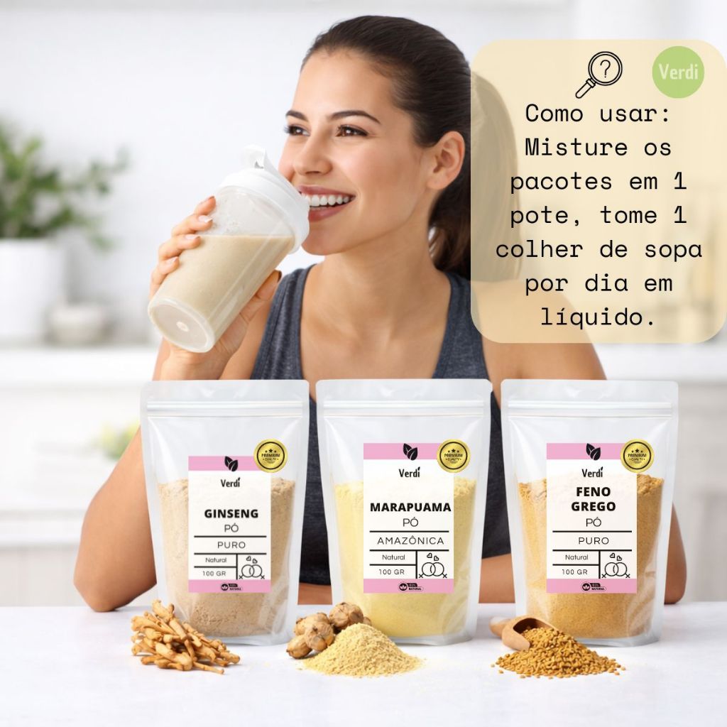 0 AÇÚCAR/ 0 LACTOSE/ 0 GLUTEN/ 0 AROMATIZANTES/ 0 CONSERVANTES Kit variação 1= 100gr ginseng pó + 100gr marapuama pó+ 100gr feno grego pó Kit variação 2= 200gr ginseng pó + 200gr marapuama pó+ 200gr feno grego pó Informações sobre o produto: Kit com 3 superalimentos em pó para auxiliar no desempenho e manutenção da vida saudável. Os produtos são puros e caso deseje pode solicitar o laudo via chat. Como usar: Pode usar individualmente, ou misture tudo em um pote e consuma 1 colher de sopa dia em líquido de preferência