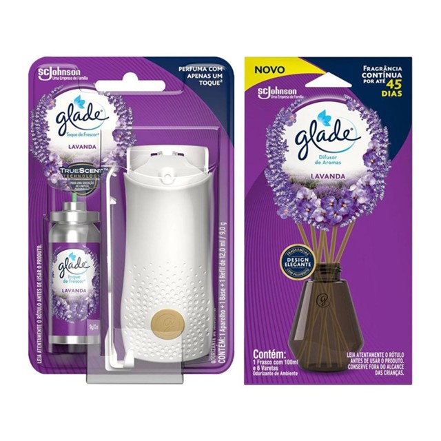 O Kit contém: - 1 Aparelho Odorizador de Ambiente Glade Toque de Frescor + Refil Lavanda 12ml; - 1 Difusor de Ambiente Glade Lavanda 100ml; Glade Toque de Frescor garante uma fragrância extra de frescor instantâneo sempre que você precisar. Basta pressionar para ativar o spray silencioso e delicado, e perfumar seu banheiro com fragrância. Seu tamanho discreto e fórmula concentrada ajudam a garantir que o ambiente do seu banheiro esteja sempre agradável, proporcionando mais confiança em apenas um toque. Glade Difusor é perfeito para enriquecer os momentos de autocuidado, mantendo sua casa perfumada por até 45 dias. Seu frasco de design moderno e elegante e suas varetas feitas com madeira de reflorestamento combinam com diversos estilos para transformar a casa em um verdadeiro santuário.