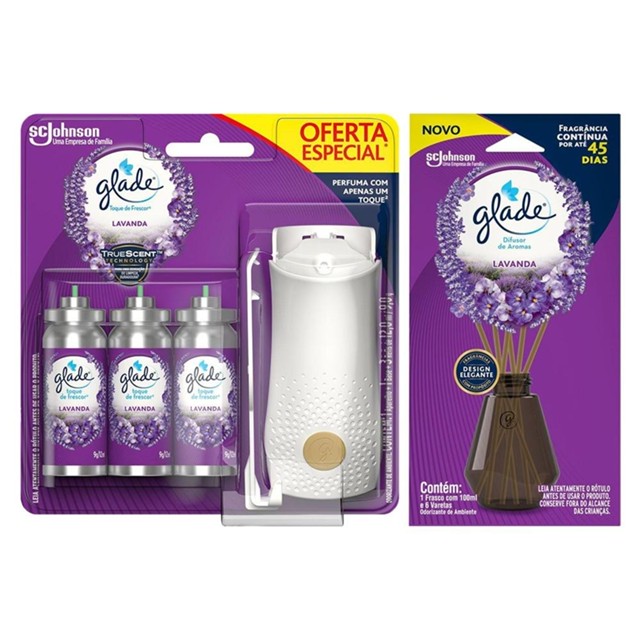 O Kit contém: - 1 Aparelho Odorizador de Ambiente Glade Lavanda Toque de Frescor + 3 Refis; - 1 Difusor de Ambiente Glade Lavanda 100ml; Glade Difusor é perfeito para enriquecer os momentos de autocuidado, mantendo sua casa perfumada por até 45 dias. Seu frasco de design moderno e elegante e suas varetas feitas com madeira de reflorestamento combinam com diversos estilos para transformar a casa em um verdadeiro santuário.