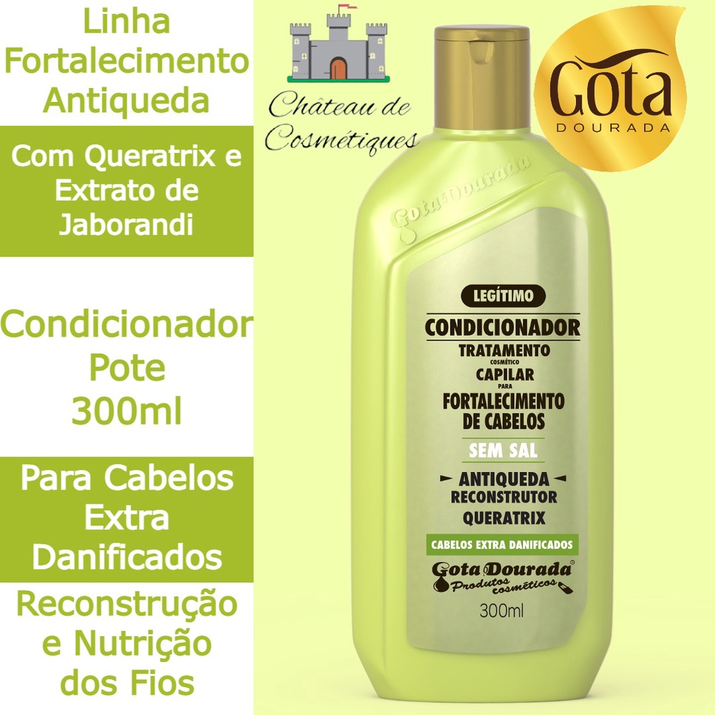 É com muita alegria que recebemos você em nosso Castelo da Beleza, o Château de Cosmétiques! Agradecemos sua visita à nossa loja e nos colocamos à sua disposição para esclarecer qualquer dúvida pelo chat. Todos nossos produtos são originais, adquiridos diretamente dos maiores fabricantes e distribuidores do país. Aqui você não precisa se preocupar com o prazo de validade dos produtos. Nosso estoque gira rápido e você sempre vai encontrar produtos novos e com prazo de validade bem longo. Em nossa loja você conta com atendimento diferenciado, envio rápido e preços justos. Convidamos você a conferir as avaliações de nossos clientes, que refletem o amor a carinho que dedicamos a cada pedido feito em nossa loja! --- Conteúdo do Kit: 1 Tônico Capilar Antiqueda Gota Dourada 100ml 1 Hidratante Sem Enxágue Antiqueda Gota Dourada 320ml 1 Shampoo Fortalecimento Antiqueda Gota Dourada 300ml 1 Condicionador Fortalecimento Antiqueda Gota Dourada 300ml 1 Máscara Capilar Fortalecimento Antiqueda Gota Dourada 500g --- FORTALECIMENTO Antiqueda Para cabelos extra danificados. QUEDA DE CABELO Cada fio de cabelo passa por três fases de desenvolvimento em seu ciclo de vida: 1. Fase de crescimento (anágena) 2. Fase de repouso (catágena) 3. Fase de queda (telógena) Se o equilíbrio entre essas três fases for interrompido, os cabelos caem em maior quantidade do que seria normal. Além de combater as causas internas, é muito importante favorecer a recuperação externa por meio de um processo de reequilíbrio do couro cabeludo e do estímulo à circulação sanguínea. Também são atribuídos outros fatores, como problemas emocionais, doenças diversas, disfunções hormonais, alimentação desequilibrada, hábitos de vida inadequados, fatores ambientais e até climáticos. A secreção excessiva das glândulas sebáceas do couro cabeludo pode engordurar o cabelo todo, tipicamente no processo da seborréia ou do eczema seborréico. QUERATRIX É um blend de Queratina com Creatina que age principalmente na reconstrução dos fios e promove resultados imediatos nos cabelos muito danificados, proporcionando extra brilho, suavidade e beleza natural. EXTRATO DE JABORANDI Auxilia no combate à queda, nutrindo e fortificando os cabelos.