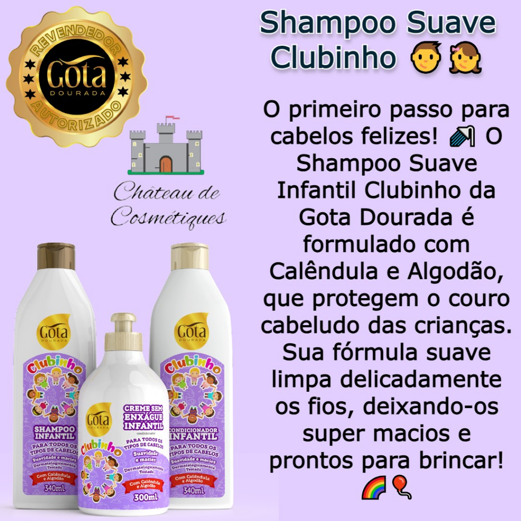 "🏰💄😊 É com muita alegria que recebemos você em nosso Castelo da Beleza, o Château de Cosmétiques! Agradecemos imensamente a sua visita à nossa loja e estamos aqui para responder a qualquer dúvida que você possa ter através do nosso chat. 💖📲 Todos os nossos produtos são originais, adquiridos diretamente dos maiores fabricantes e distribuidores do país. Garantimos a qualidade e a autenticidade de cada item que oferecemos. ✨🔒 Aqui, você não precisa se preocupar com o prazo de validade dos produtos. Mantemos um estoque atualizado, garantindo que você sempre encontrará produtos novos e com um prazo de validade longo. 📅🆕 Na nossa loja, você desfruta de um atendimento diferenciado, envio rápido e preços justos. Convidamos você a conferir as avaliações de nossos clientes, que refletem o amor e o carinho que dedicamos a cada pedido realizado em nosso estabelecimento. 🌟🙌👥 Estamos aqui para tornar a sua experiência de compra única e satisfatória. Explore nosso Castelo da Beleza e descubra os segredos dos cosméticos que irão realçar ainda mais a sua beleza natural. 💎💅💖 ===== Você vai receber: Kit Gota Dourada Infantil Clubinho Suave composto por: 01 Un. Shampoo Suave Infantil Clubinho 340ml Gota Dourada 01 Un. Condicionador Suave Infantil Clubinho 340ml Gota Dourada 01 Un. Creme de Pentear Suave Infantil Clubinho 300ml Gota Dourada ===== Conheça todos os nossos produtos da linha Cuidados Para Crianças, além de kits feitos especialmente para você: Clique no botão ""Ver Loja"" e procure pelo Banner ""Linha Kids"". ===== 🎉🌈 Seja bem-vinda ao mundo encantado do Clubinho Kids! 🌈🎉 🚀 Apresentamos o Kit Infância Feliz: a combinação perfeita para os cuidados capilares mágicos dos pequenos heróis e princesas! 💫✨ 🧴 O Shampoo Suave Infantil Clubinho é o segredo para cabelos limpos, cheirosos e macios como algodão doce! 🍬 Sua fórmula especial, enriquecida com ingredientes naturais, cuida com carinho dos fios sensíveis das crianças, proporcionando uma limpeza suave e eficiente, sem irritações! 😍✨ 🌸 Queremos mais sorrisos brilhantes com o Condicionador Suave Infantil Clubinho! 🌟 Sua magia transforma cabelos emaranhados em cabelos sedosos e desembaraçados, prontos para enfrentar as aventuras do dia a dia! ✨ A poderosa mistura de ingredientes nutritivos deixa os fios mais saudáveis e com um toque de leveza inconfundível! 🦄💕 🎶 Ah, e a diversão não para por aí! 🎶 O Creme de Pentear Suave Infantil Clubinho chegou para arrasar! 💃 Com ele, os cabelos ganham uma dose extra de brilho e proteção contra os vilões do frizz e das pontas duplas! 💥 Prepare-se para cabelos ainda mais lindos e comportados durante todo o dia, com um cheirinho delicioso de alegria contagiante! 🍭🌟 👉 Resultado? Cabelos dos sonhos que até a fada madrinha vai se impressionar! ✨🧚♀️ E a melhor parte é que nossos produtos são livres de parabenos e sulfatos, trazendo apenas o que há de melhor da natureza para os pequenos brilharem muito! 🌿🌈 🌟 Está esperando o quê? Realize o desejo do cabelo perfeito para suas crianças com o Kit Infância Feliz Clubinho Kids! 🌟 Peça agora mesmo e garanta que seus pequenos tenham fios saudáveis e radiantes, prontos para viverem grandes aventuras e encantarem o mundo! 🚀💖 🎁🎈 Não perca tempo, garanta o seu Kit Infância Feliz agora mesmo! Afinal, sorrisos felizes e cabelos encantadores esperam por você! 🎈🎁