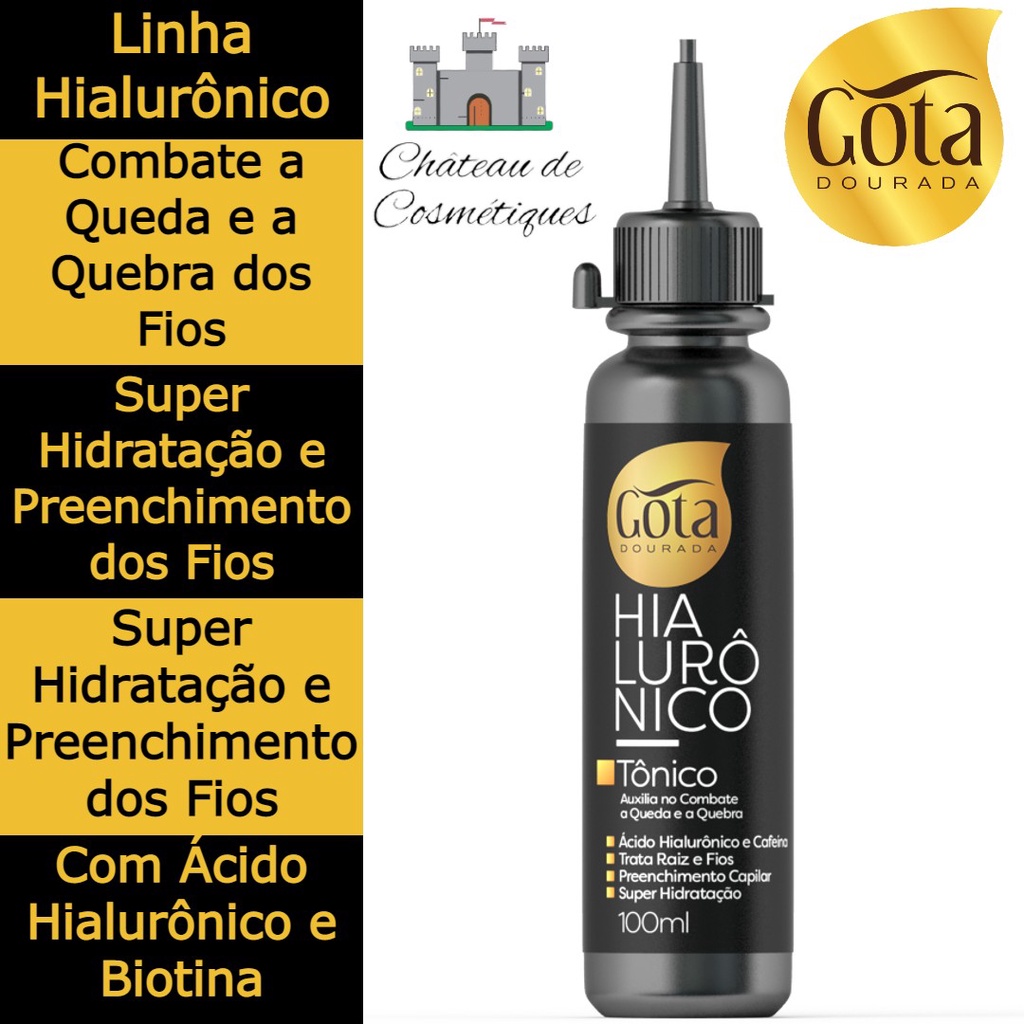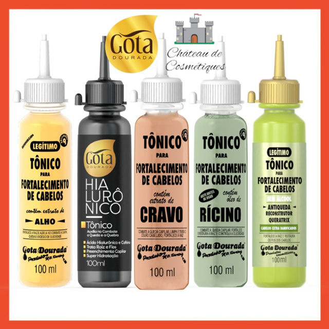 É com muita alegria que recebemos você em nosso Castelo da Beleza, o Château de Cosmétiques! Agradecemos sua visita à nossa loja e nos colocamos à sua disposição para esclarecer qualquer dúvida pelo chat. Todos nossos produtos são originais, adquiridos diretamente dos maiores fabricantes e distribuidores do país. Aqui você não precisa se preocupar com o prazo de validade dos produtos. Nosso estoque gira rápido e você sempre vai encontrar produtos novos e com prazo de validade bem longo. Em nossa loja você conta com atendimento diferenciado, envio rápido e preços justos. Convidamos você a conferir as avaliações de nossos clientes, que refletem o amor a carinho que dedicamos a cada pedido feito em nossa loja! --- O kit contém 5 Tônicos Capilares Gota Dourada 100ml cada: 01 - Tradicional de Alho 01 - Hialurônico 01 - Cravo 01 - Rícino 01 - Antiqueda --- Tradicional Alho: Tônico para Fortalecimento de cabelos Gota Dourada foi desenvolvido com Óleo de Alho, Extrato de Alho, Extrato de Aloe Vera e Calêndula, que fortalecem a raiz enfraquecida, auxiliando no combate à queda. --- Hialurônico Auxilia no combate de quebra e queda Agora você pode tratar a raiz e os fios dos cabelos com o Tônico Hialurônico e Cafeína Gota Dourada. O Ácido Hialurônico é um potente preenchedor dos fios e proporciona super hidratação, combatendo a quebra capilar. A Cafeína fortalece a raiz e os fios promovendo um crescimento saudável e raízes mais fortes. O tônico completo para raiz e fios, com resultados surpreendentes e cabelos saudáveis e maravilhosos. --- Biotina Auxilia no crescimento dos cabelos O Tônico para Fortalecimento de cabelos Gota Dourada com Biotina é um super fortalecedor da raiz e dos fios, auxiliando no crescimento acelerado e combatendo a queda e a quebra capilar. --- Rícino Combate a queda capilar, fortalece e restaura a raiz e controla a oleosidade O Tônico para Fortalecimento de cabelos Gota Dourada com Óleo de Rícino, fortalece todo o comprimento dos fios e a raiz dos cabelos, resultando em cabelos mais fortes e brilhantes, combate a queda e a oleosidade excessiva. --- Antiqueda Os cabelos danificados necessitam de um potente ativo reconstrutor para impedir a queda causada pela quebra dos fios. O Tônico para Fortalecimento de Cabelos Antiqueda Queratrix Gota Dourada age profundamente nos fios: - Combatendo a queda e os danos causados por alisamento, tintura e escovas; - Penetra nos fios reparando a estrutura danificada; - Reconstrutor dos fios extra danificados; - Sem extrato de alho. O Queratrix (Queratina + Creatina) age principalmente auxiliando na reconstrução dos fios, proporcionando extra brilho, suavidade e beleza naturais aos cabelos muito danificados. --- Fazer a prova de toque. Aplicar 1 dose somente na raiz dos cabelos, deixe agir por no mínimo 2 horas. Fazer o tratamento 3 vezes por semana, durante 3 meses. PROVA DE TOQUE: Aplique uma pequena quantidade do produto no antebraço ou atrás da orelha e deixe-o agir por 45 minutos. Em seguida, lave o local e aguarde 24 horas. Caso apareça irritação, ardência ou coceiras na pele, o produto não deve ser utilizado.