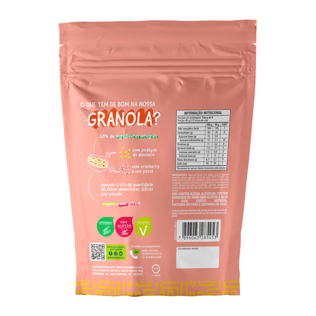A granola sem glúten frutas tropicais da Vitao é uma opção nutritiva e saborosa para começar o dia com energia. Feita com ingredientes selecionados e livres de glúten, essa granola é perfeita para pessoas com restrições alimentares. Ela é cuidadosamente preparada com uma combinação de flocos de cereais, castanhas, sementes e frutas desidratadas, proporcionando um mix equilibrado de sabores e texturas. As frutas adicionam um toque naturalmente doce à granola, enriquecendo-a com vitaminas e fibras. É Um acompanhamento versátil, podendo ser consumida com iogurte, leite, smoothies ou como um lanche crocante por si só. Desfrute dessa granola sem glúten tradicional com frutas e aproveite um café da manhã saudável e saboroso. INGREDIENTES: Aveia em flocos sem glúten, açúcar mascavo invertido, açúcar mascavo, flocos de arroz, VITAO FLAKES sem glúten, flocos de milho não transgênico, óleos vegetais (soja, milho e algodão), cranberry em passa, coco granulado, ameixa seca em cubos, damasco em cubos, sal marinho, cúrcuma, antioxidantes lecitina de soja, INS 330, INS 320 e INS 321, corante urucum e aroma. ALÉRGICOS: CONTÉM DERIVADOS DE AVEIA (SEM GLÚTEN) E SOJA E PODE CONTER AMÊNDOA, CASTANHA-DO-PARÁ E CASTANHA-DE-CAJU. NÃO CONTÉM GÚTEN. INTEGRAL, SEM GLÚTEN, VEGANO, FONTE DE FIBRAS, BAIXO EM SÓDIO.